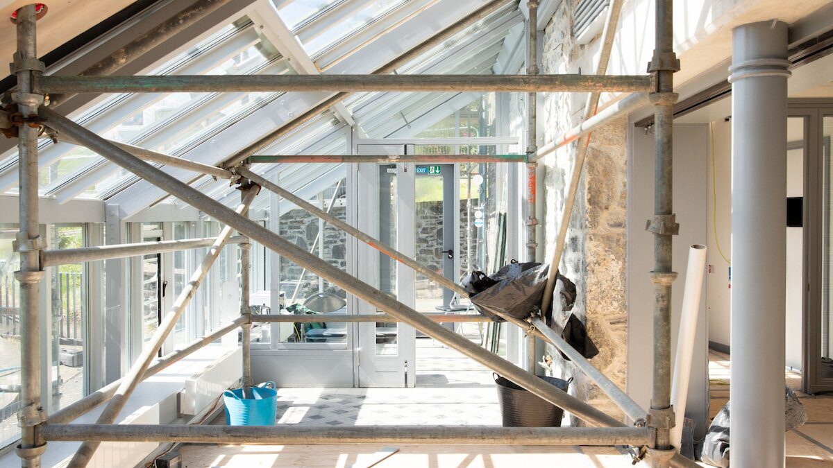 It’s a bit bizarre to see Bonhoga covered in scaffolding (inside and out), the walls all stripped back to the bare bones, wooden flooring removed. The roof tiles are currently being replaced, as are the windows. Speaking of which, the windows in the gallery caused a bit of confusion for the builders – have you ever noticed that the number on the outside doesn’t always match the number on the inside? This is because depending on which exhibition was using the space, we could cover or reveal as many windows as needed for the right amount of lighting! Our previous Maintenance Technician Angus was a whizz at coming up with solutions on how to do this, to make it hardly noticeable.