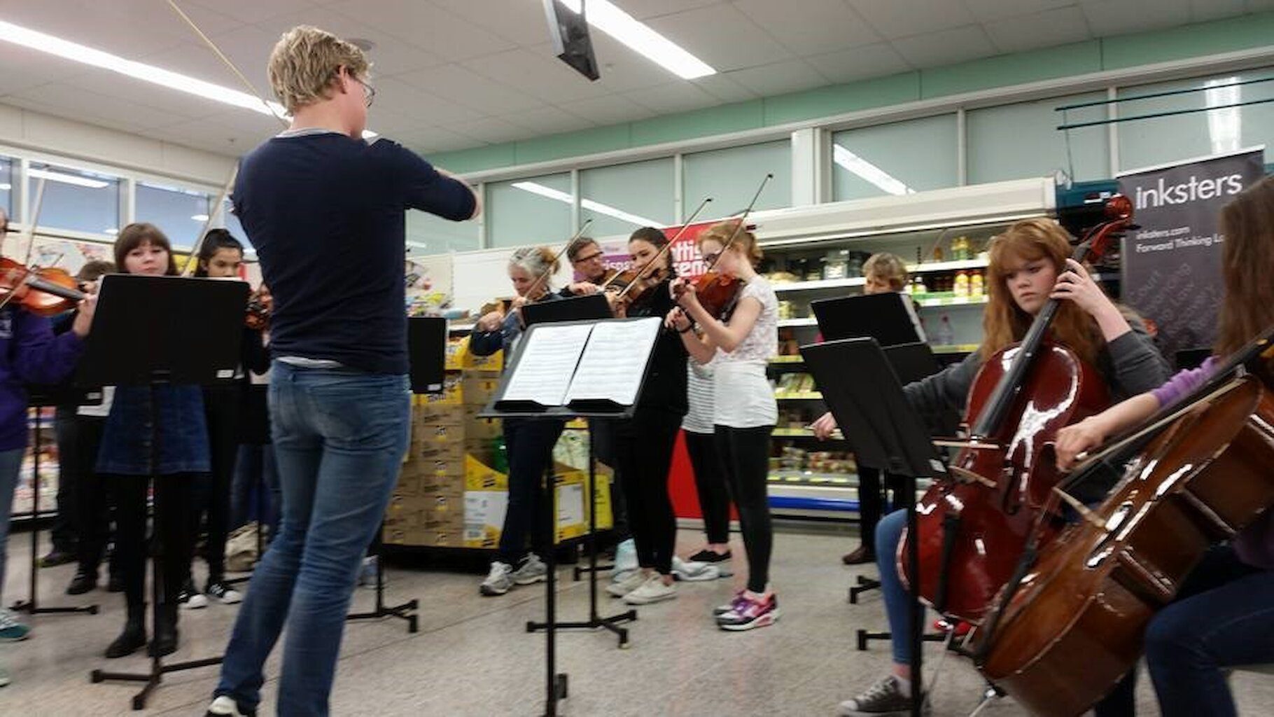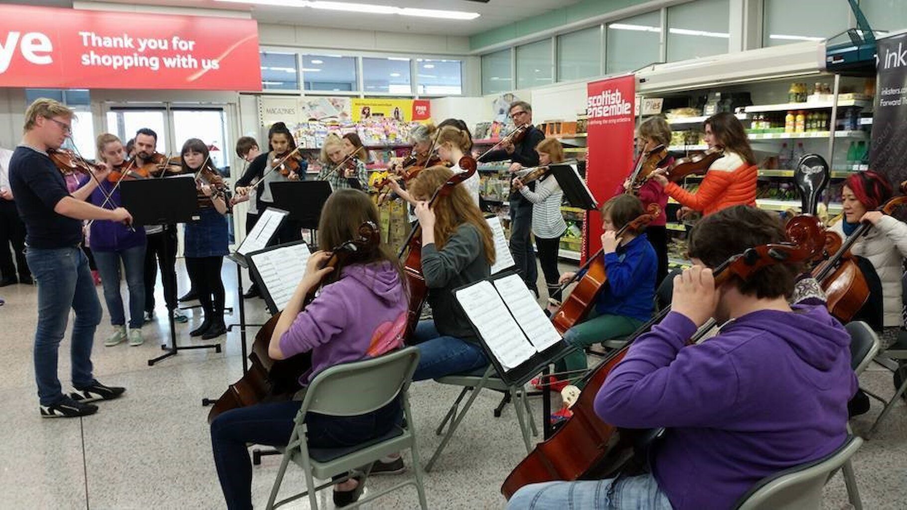 Friday saw members of the Ensemble tutor a large group of students at the Anderson High School, who had requested to work on a selection of pieces. After the workshop, pupils shared their work with family and friends, and then they were transported to Tesco for a pop up performance with the Scottish Ensemble, which attracted a huge crowd of excited onlookers.