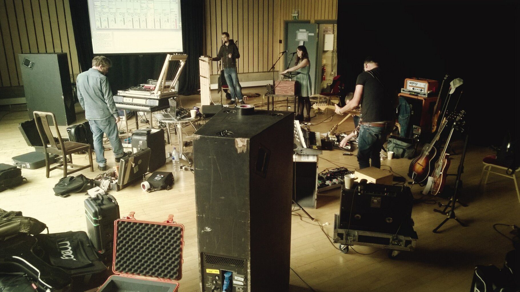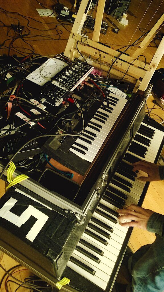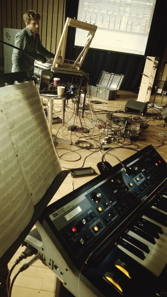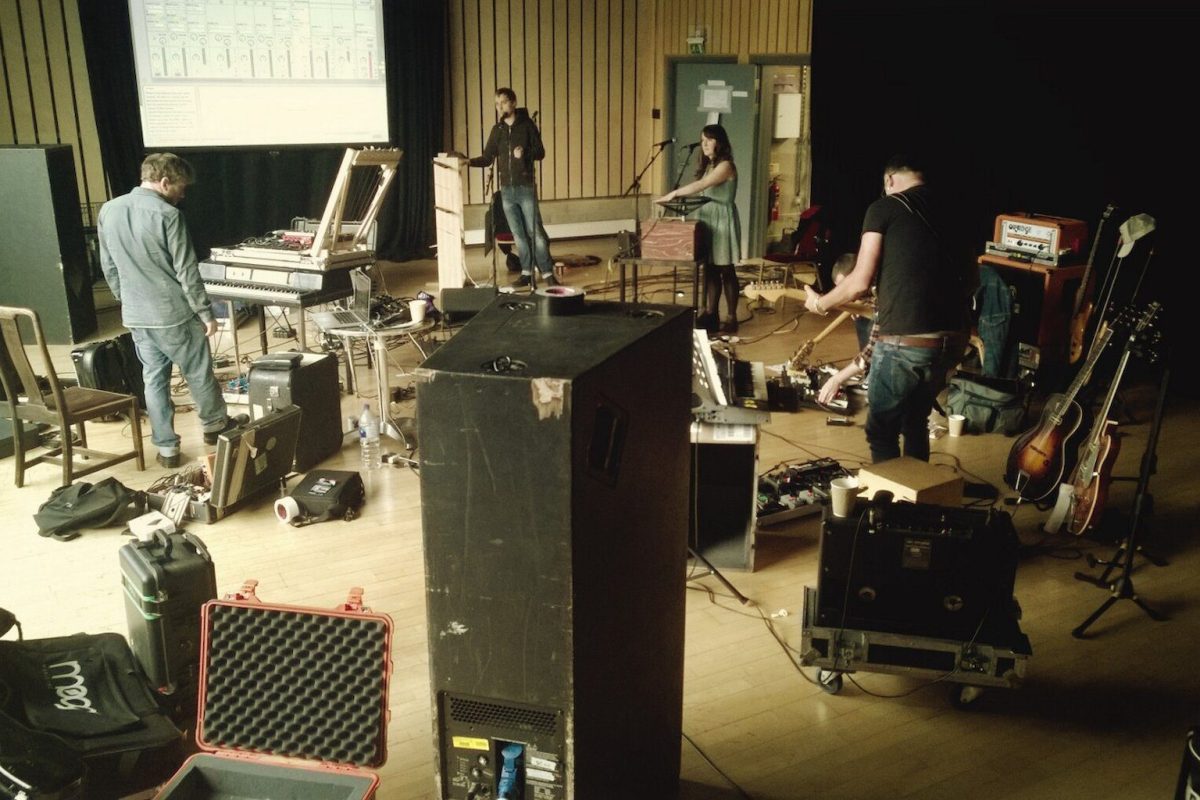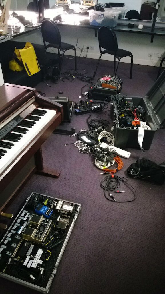 We’re set up in a smallish room here in the Junction in Cambridge and it is now mostly full of bits of musical electronica joined together by piles of tangled cabling. By the end of the day we’ve run through the show 3 times and it’s starting to stick together again.
