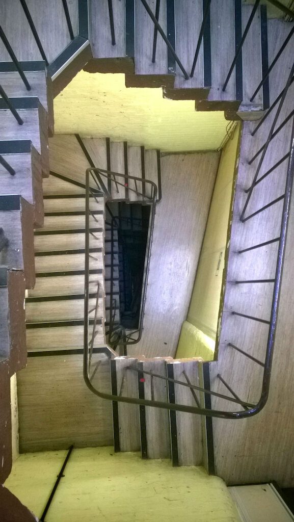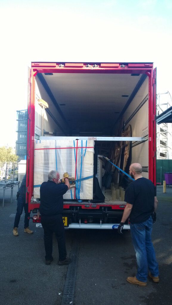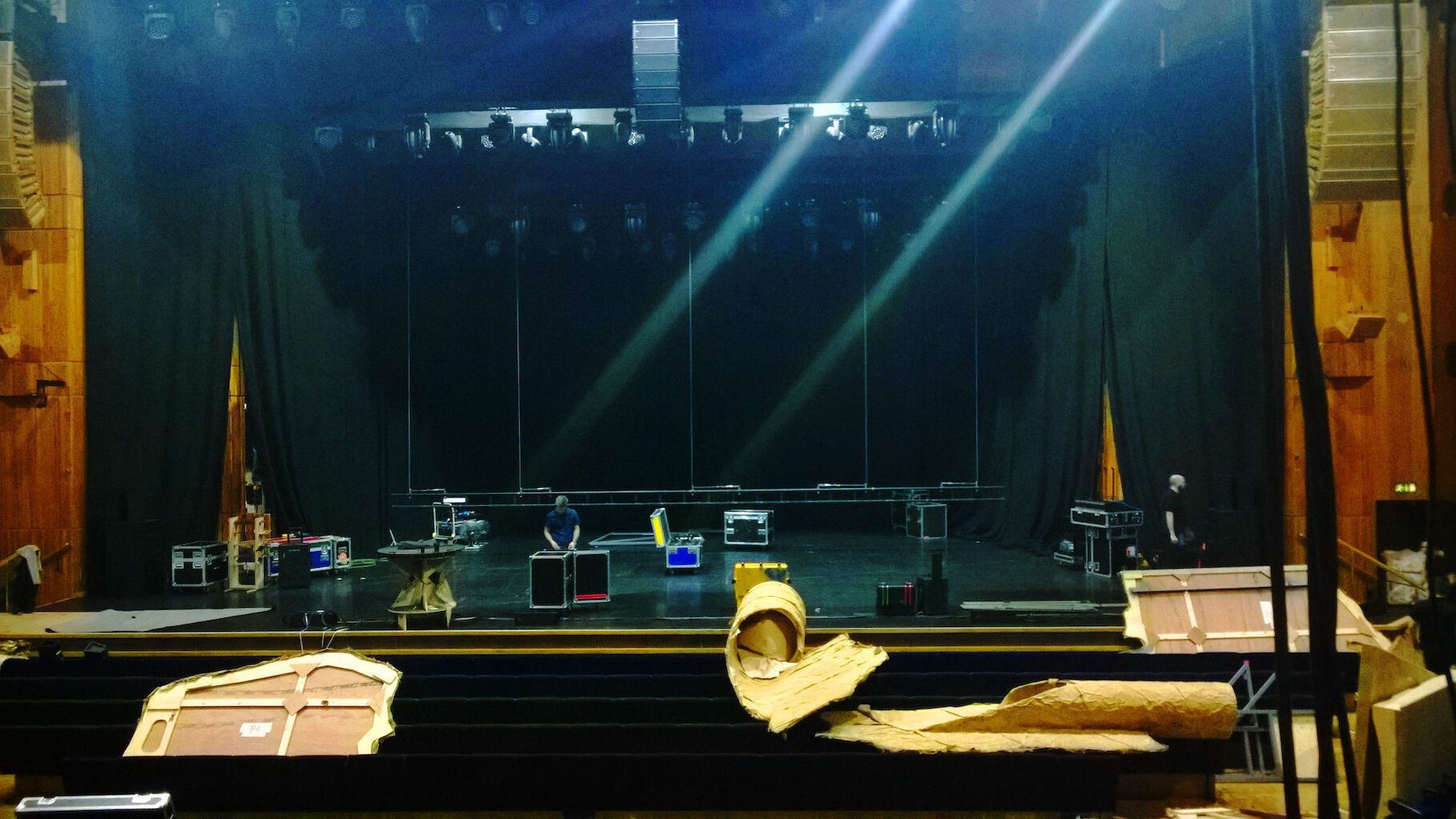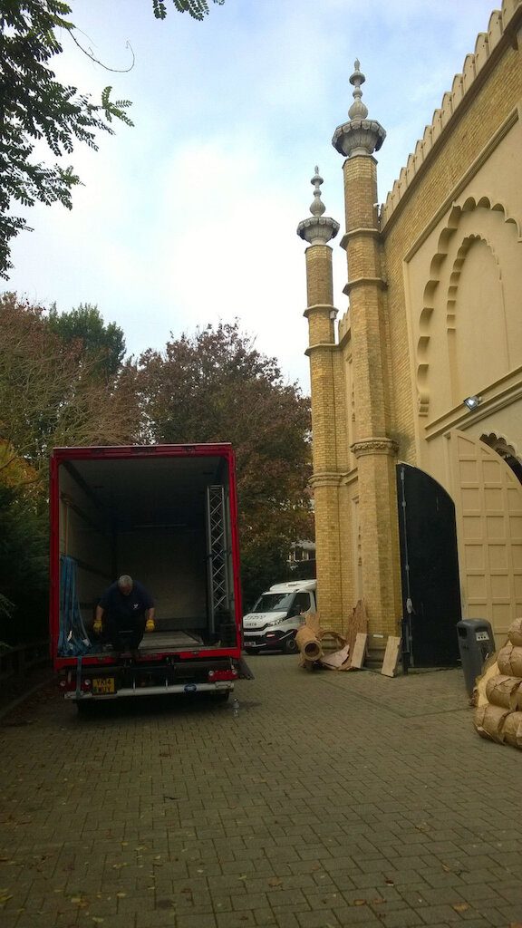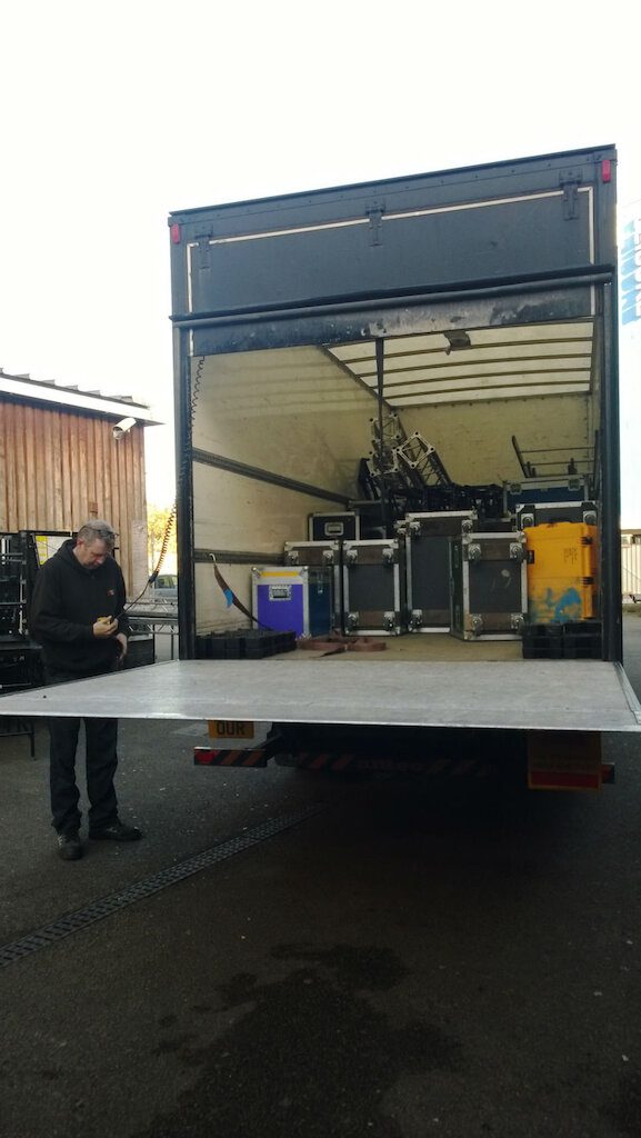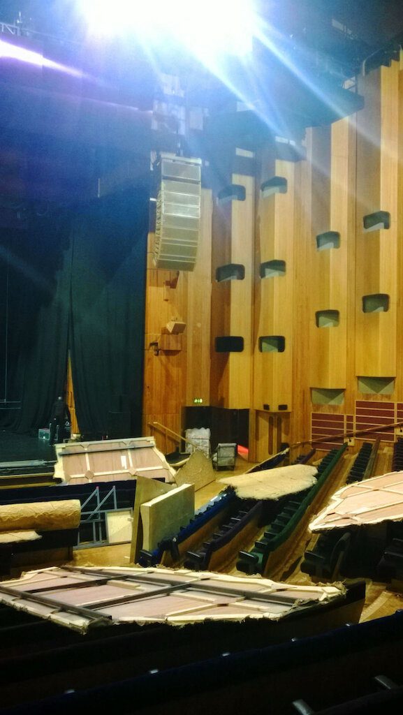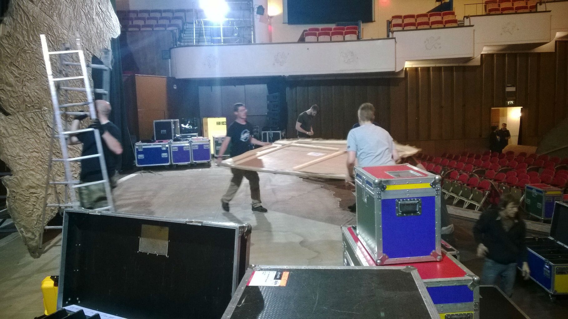 Today’s loadin is tricky. The venue is two floors down. The set is too big for the lift and the lorry too high for the underground passage so the big items must be carried down the passage, through the lobby, into the auditorium and down through the seating onto the stage. It’s a pretty long-winded operation and we’re not looking forward to the loadout at the end of the night.