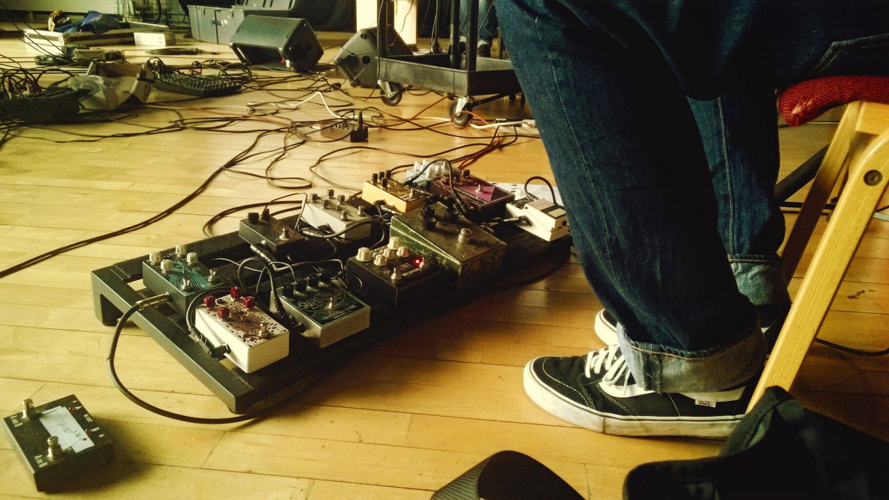 A shower and a good cup of coffee and I’m ready for another load-in. This venue is an even smaller rom than last night and it’s a serious challenge getting all the set in. I leave the experts to it and turn my attention to Martin’s equipment. Although my job on this tour is sound engineer, I’m also here as an expert in Martin’s setup, which is idiosyncratic to say the least. Yesterday’s gig was after a few days rehearsal and Martin’s gear had organically grown into a pile of teetering effects pedals with tangled festoons of wire – like some weird art installation. It took about an hour and a half to pack away. Today I spent a large portion of my time pulling it all apart and rebuilding it into neat and tidy usable blocks of technology. Very satisfying. The dressing room looked like an explosion in a cable factory for a while.