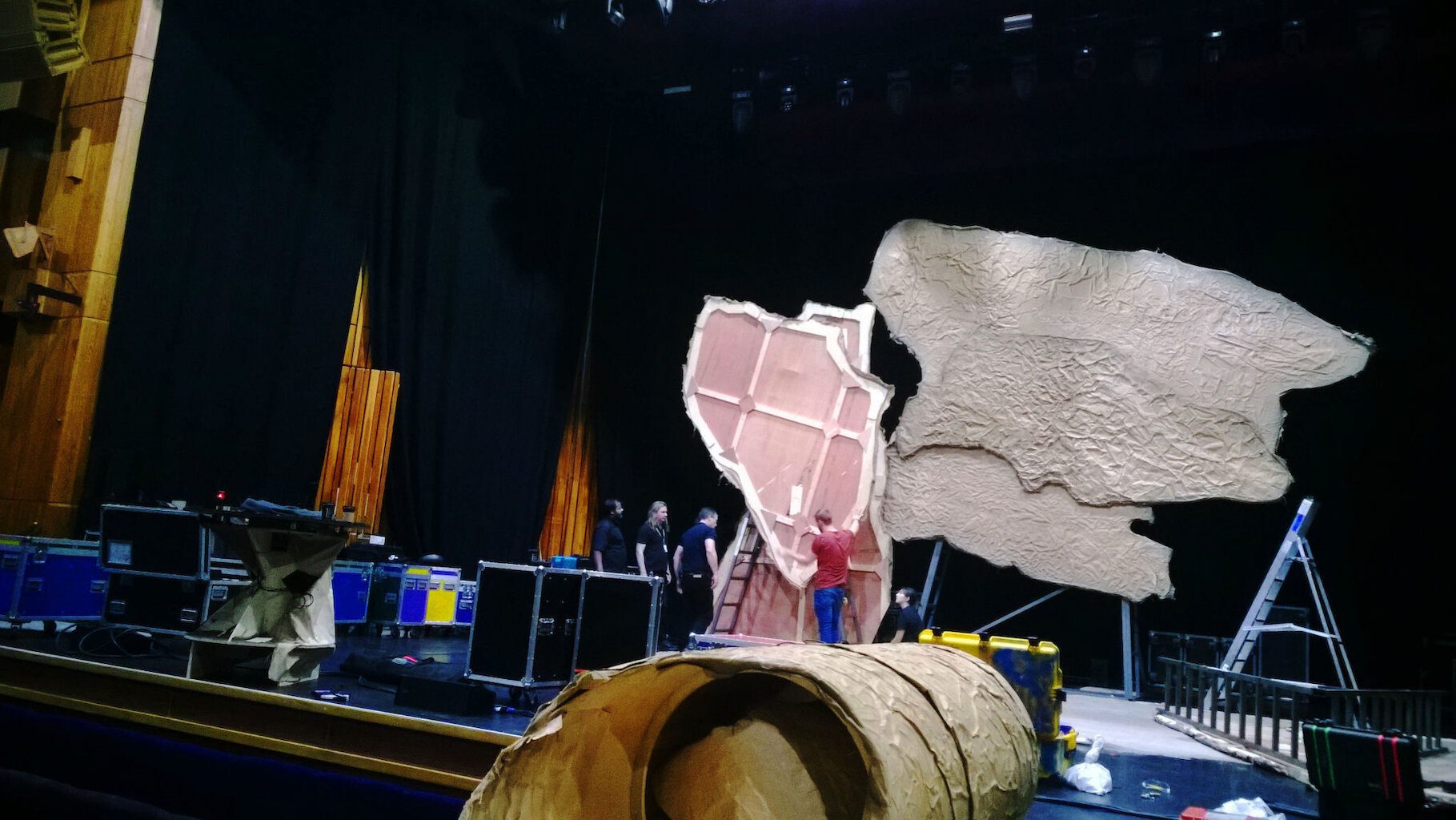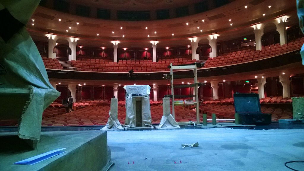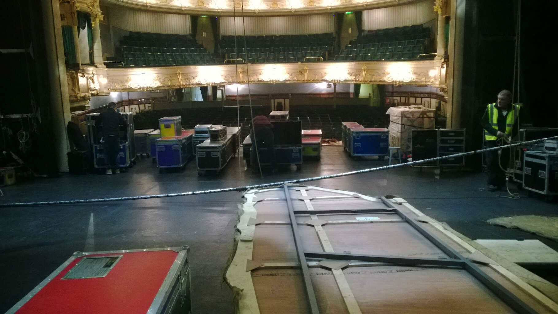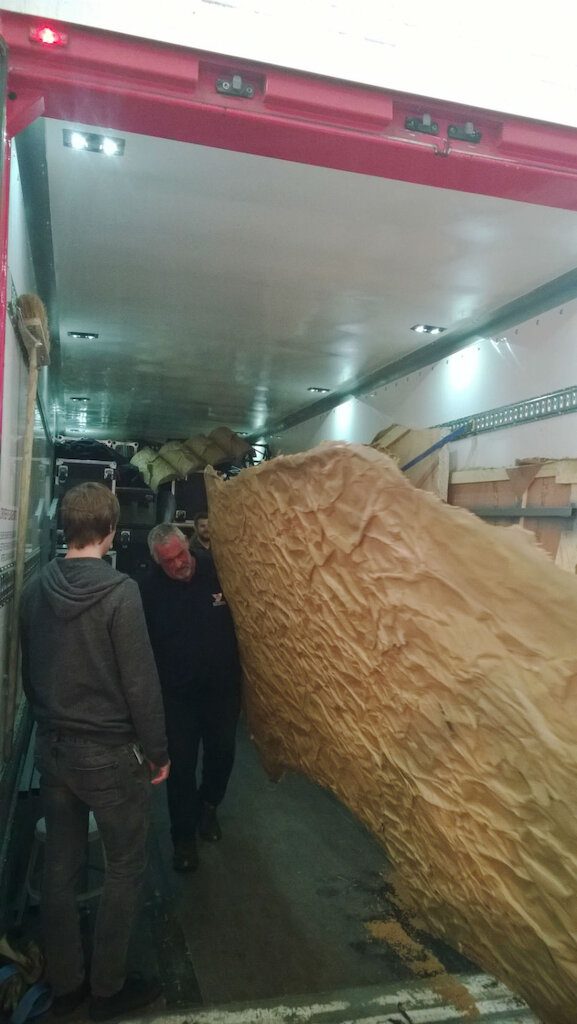 Much refreshed after our day off we head across to today’s venue – Colston Hall. It’s a beautiful place, an old, old concert hall with a cool glass-fronted modern extension. When we arrive the local crew are waiting for us. Local crews are a fascinating breed. When you’re on tour they are the people who will provide you with the most intense experience of the local accent/dialect. I think it’s a lifestyle choice being local crew. They are wild, piratical, unkempt, often on the fringes of society, definitely a subculture of their own always delighted to heft heavy boxes in and out of trucks and venues. Today’s are no exception. With constant shouting, verbal abuse and jostling they help us get our stuff in. Now (as the crew told me), millions of pounds have been spent building the new part of Colston Hall but nothing much has been done to the concert hall itself which remains mostly unchanged from decades ago. Beautiful, slightly threadbare grandeur. This is one of the Biggest venues on the tour with some of the smallest doors! The result of this is that some of the biggest bits of set have to travel around the venue before we can align them up with doors that’ll take them.