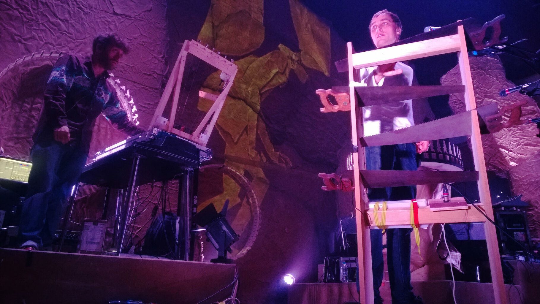 A London show on a tour is always a big one – bigger audience, more likelihood of being reviewed and usually more pals turning up. This is no exception and there is a little bit more adrenaline backstage before we start. This is aided by the fact that the centrepiece of the set, the massive zoetrope stopped working during soundcheck. Much scrabbling around, rewiring and hammering and it eventually came back to life. Handy as we don’t have a spare.