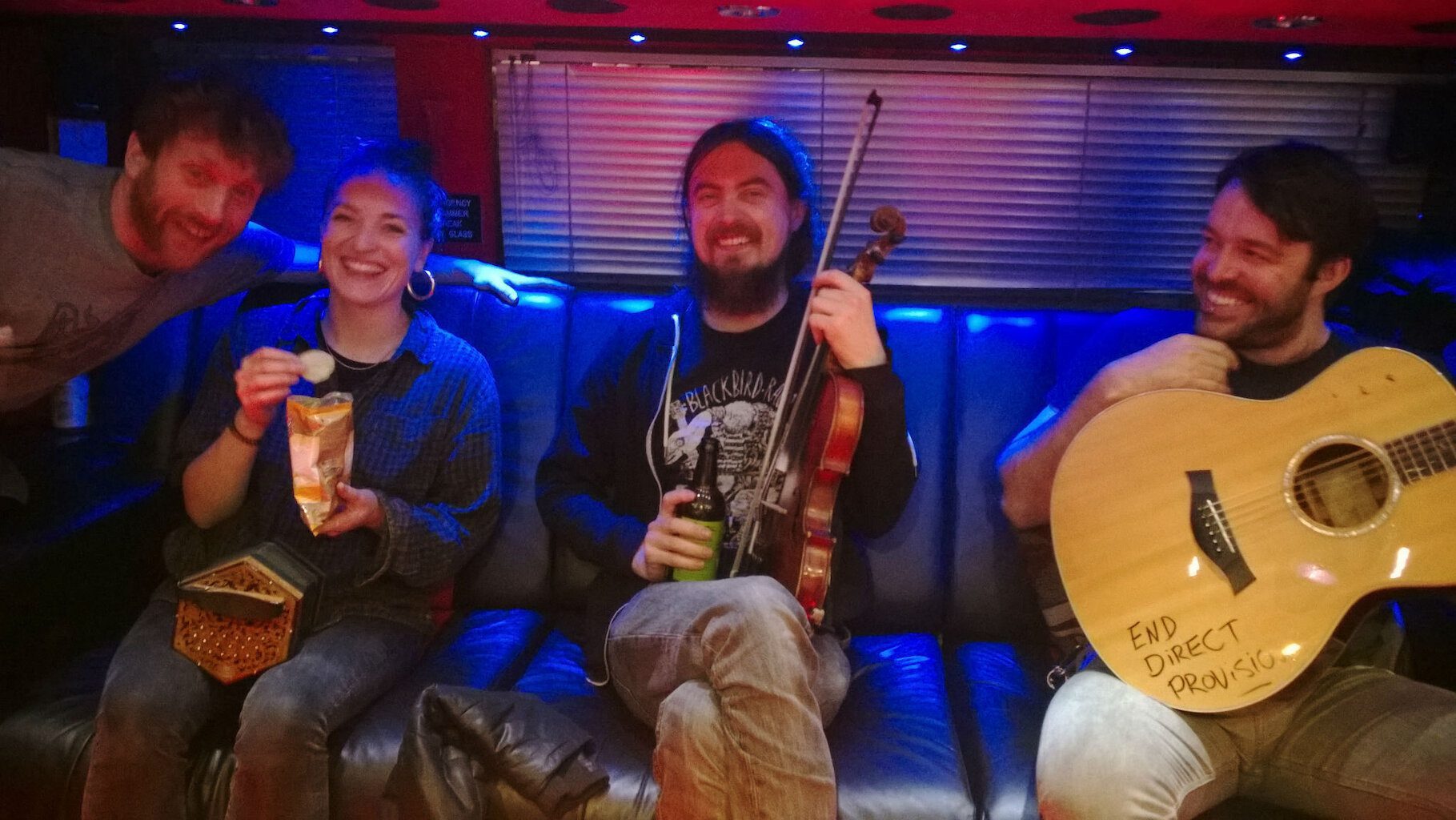 The gig was very good, best yet and after loadout I arrive back at the bus to find we’ve been visited by our pals Lynched – a fantastic folk band from Dublin. They’ve been playing in town as well and we have a good few beers and a fine tune before our driver fires up the engine and we head off into the night headed for London.
