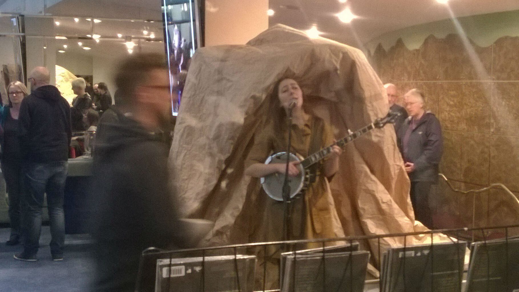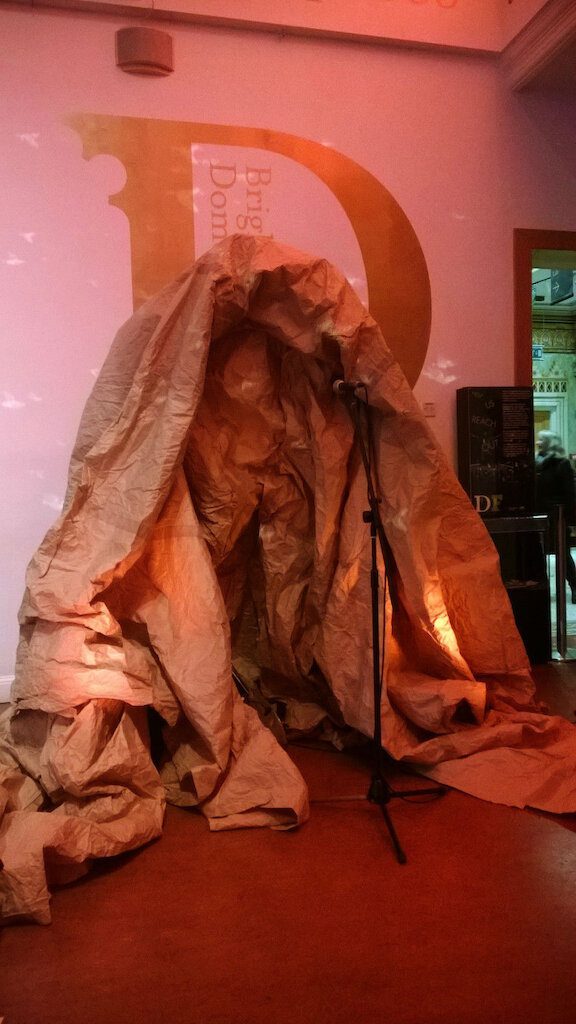On this tour we have a pal Rhona Dalling who is acting as a support act – not on stage but out in the foyer. She has built a kind of cave out of brown paper in which she performs each night. It’s a nice way of making our presence felt in the building even before the audience enters the performance space.