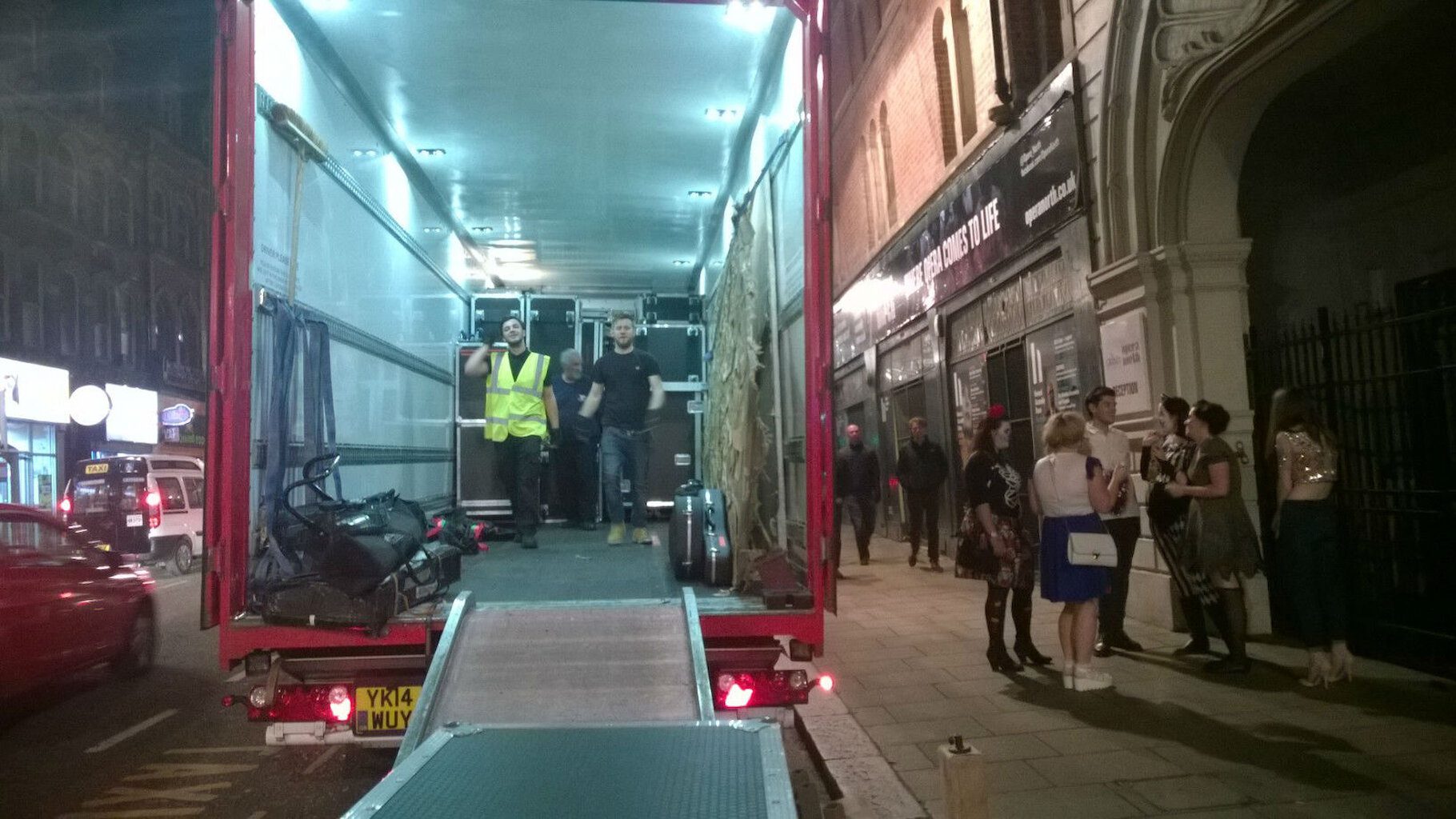 Load out was even longer as it was the same time as the opera loaded out of the theatre. This meant we had to park our truck on the main street in the middle of a Saturday night at Hallowe’en. Pushing boxes and carrying set up a hill and round a corner. It was also extremely entertaining though as we were accosted by zombies, pirates and regular drunk Leedsites throughout proceedings.