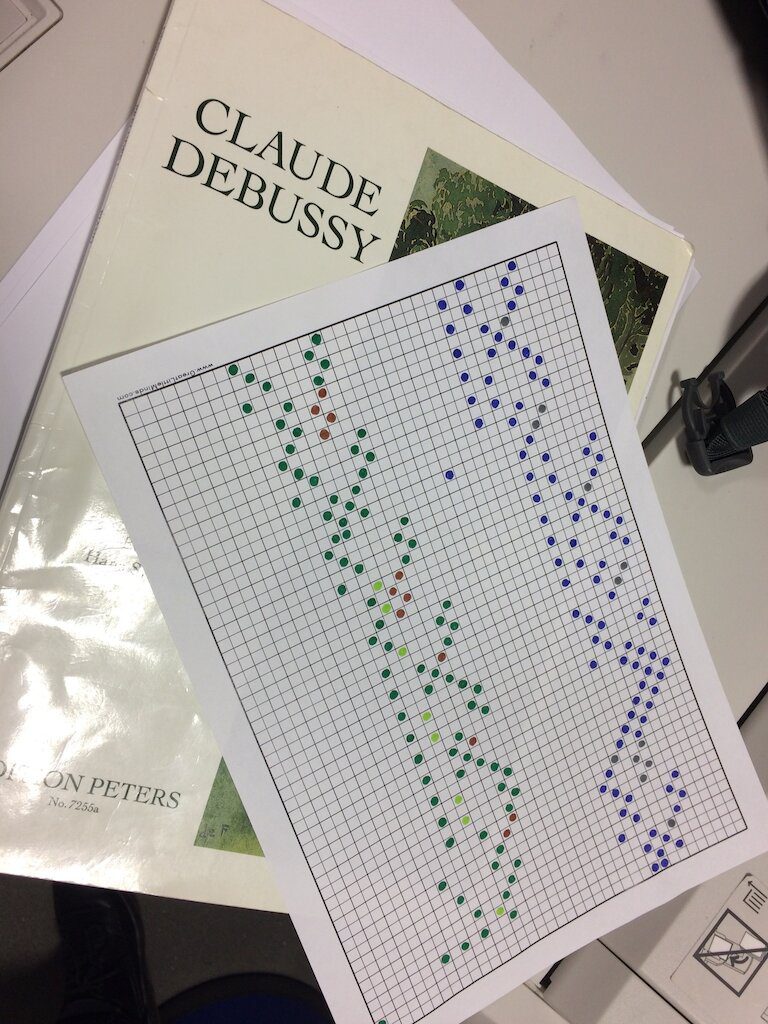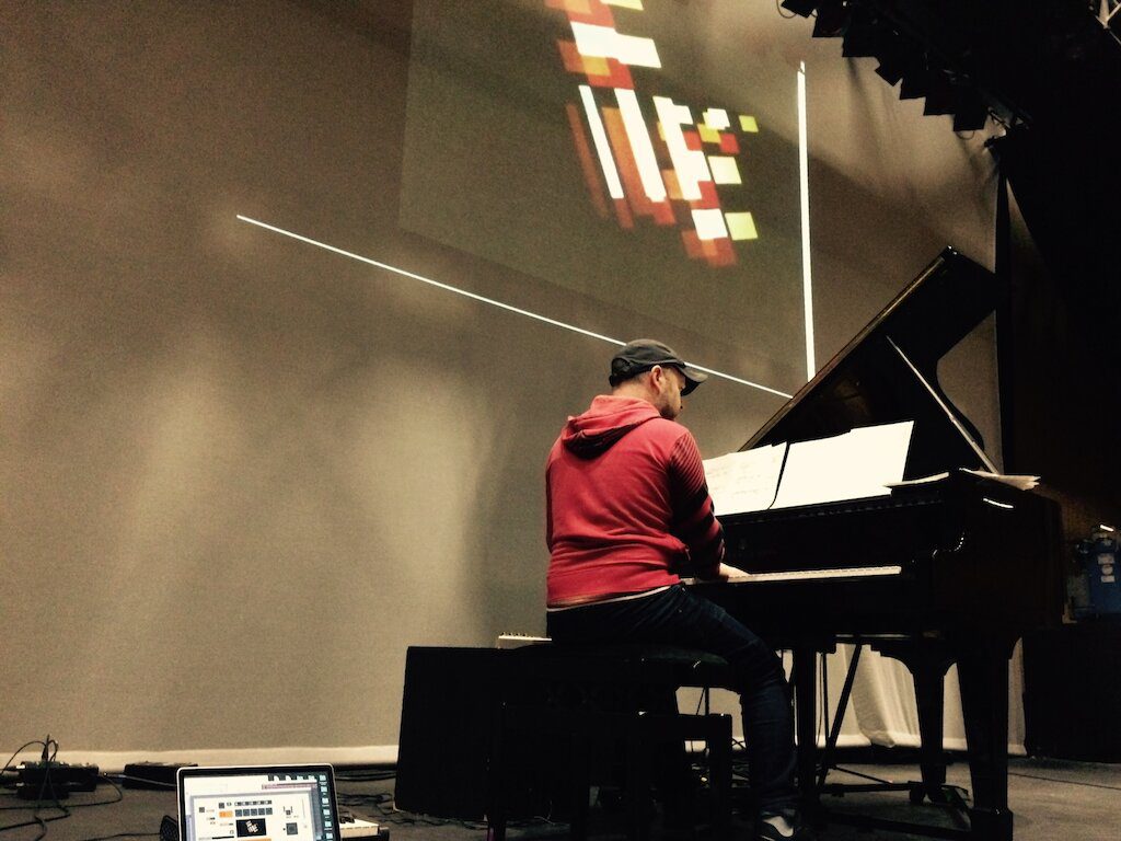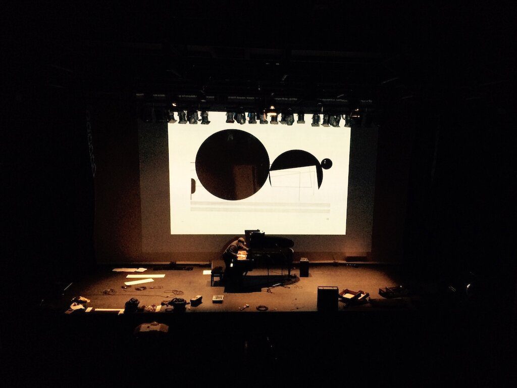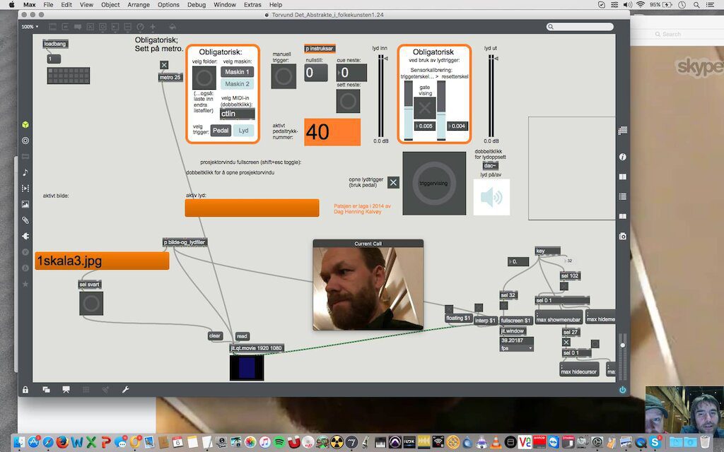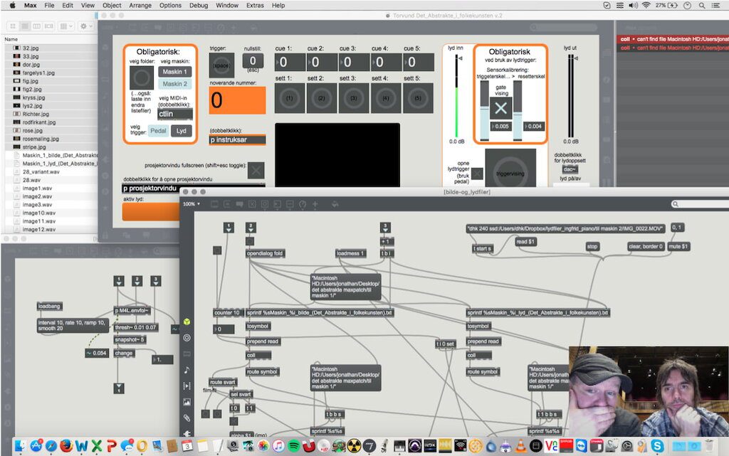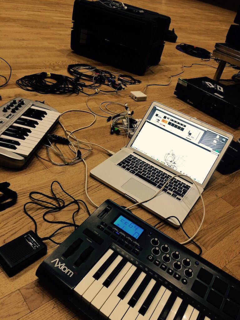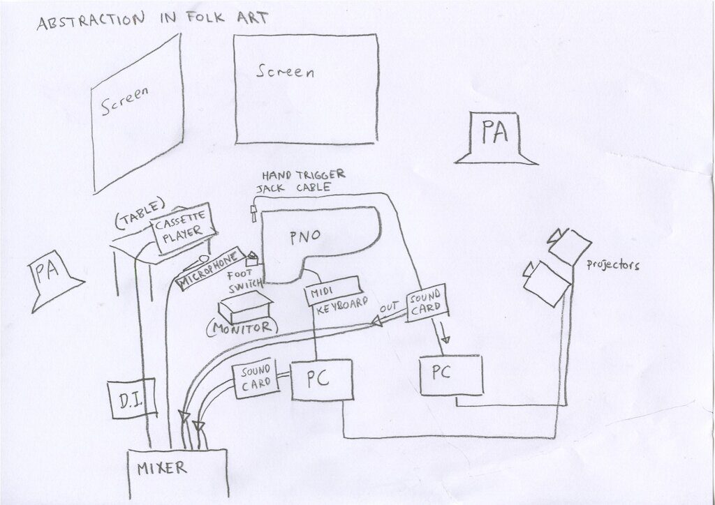 Whilst we’re no strangers to projection, the technical requirements for this show have taken things up a notch. For the piece Abstraction in Folk Art by Øyvind Torvund, there are two projectors, live MIDI triggering of audio and video and a viper’s nest of virtual and real patch leads and interconnects required to make it all happen. Here’s the nicely drawn tech spec from the Bergen-based composer: