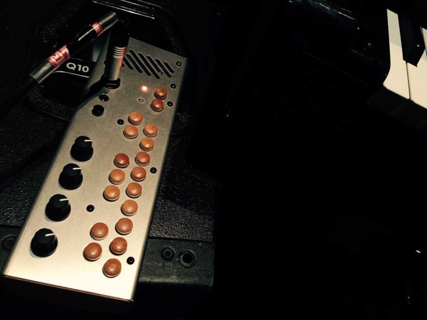 We hooked up the various machines with cables and connectors aplenty, even pressing Tim Matthew’s pocket synth into service as a triggering device. Note the lovely tactile wooden keys!