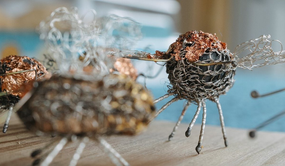 The silver wire will naturally tarnish in time to a more realistic black. It is possible to speed up this process using acid but I like the idea of the bees interacting with the environment and aging in their own time.