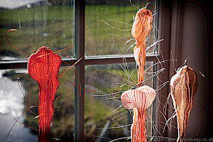 For “Portage; textiles, extremes of scale. “ Bonhoga Gallery is linked to the Town Centre of Lerwick by a digital projection, sent by email from Finland to Shetland as the largest scale exhibit. ‘Bedtime Stories’ expresses a shared message, the language of worldwide chatting, inspired by a woven textile structure and created for Shetland by Finnish textile artist, Outi Martikainen as a covering for a building. Among the smallest in scale are brooches of silk cocoons by Jo Pond and wrapped sculptural jewellery by Tanvi Kant.