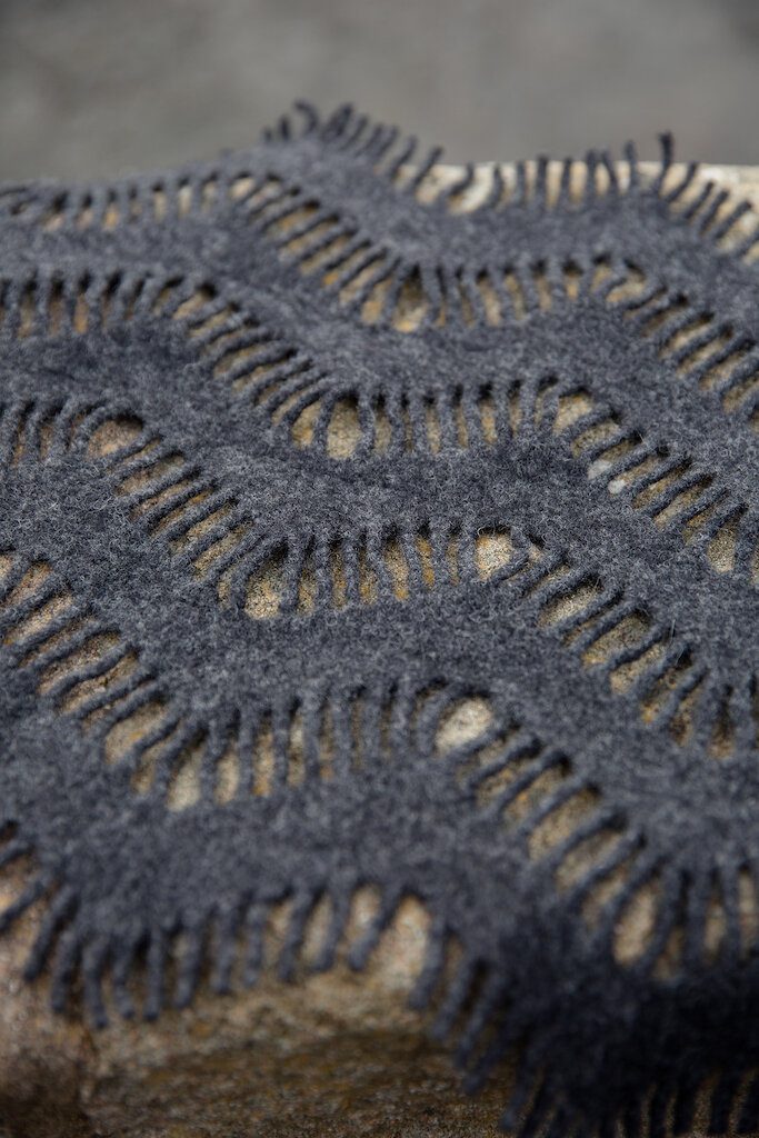 Each piece is carefully designed, machine made and hand finished by Jo. She is particularly drawn to Merino wool because of its sustainable, renewable and biodegradable qualities, creating durable textiles with a luxuriously soft handle and drape.