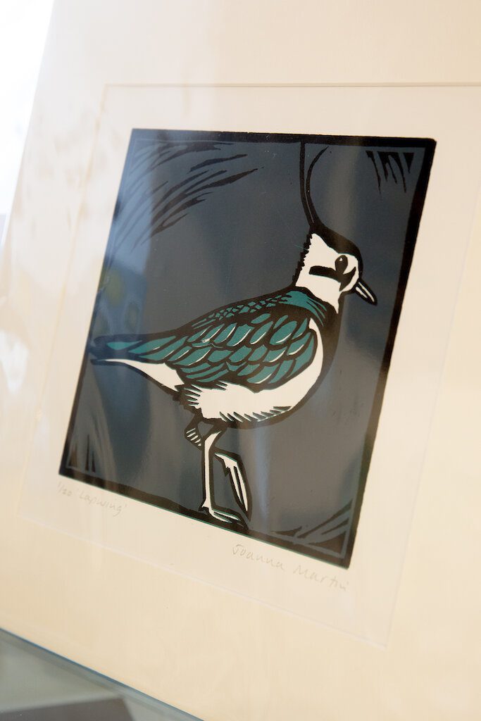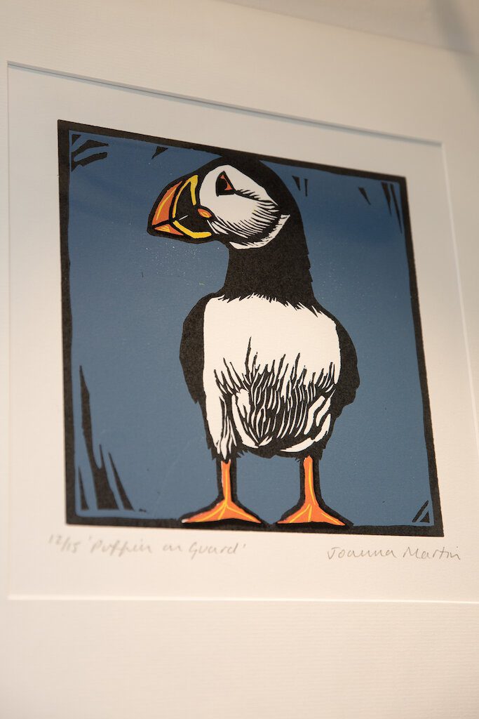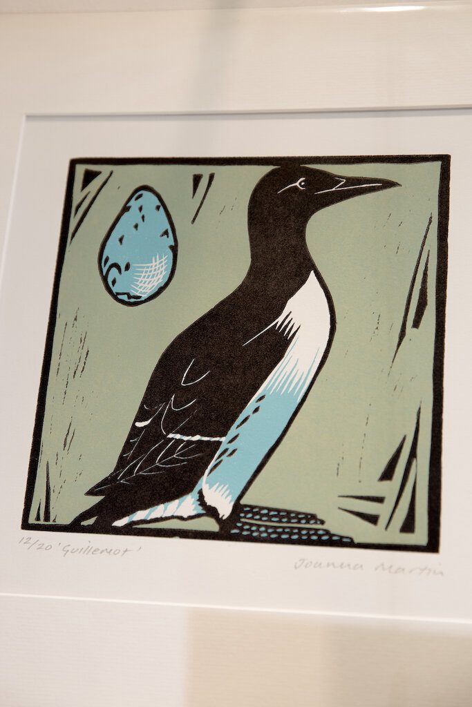 Joanna’s passion for birds is expressed beautifully in her seabird lino cuts. Her printmaking takes place at the Seacourt Print Workshop in Bangor. Linocuts are handmade prints created by cutting a design into a piece of linoleum or Japanese vinyl to produce a relief surface that can then be rolled up with ink and printed from. Cutting and printing the lino again means colours can be built up on top of another.