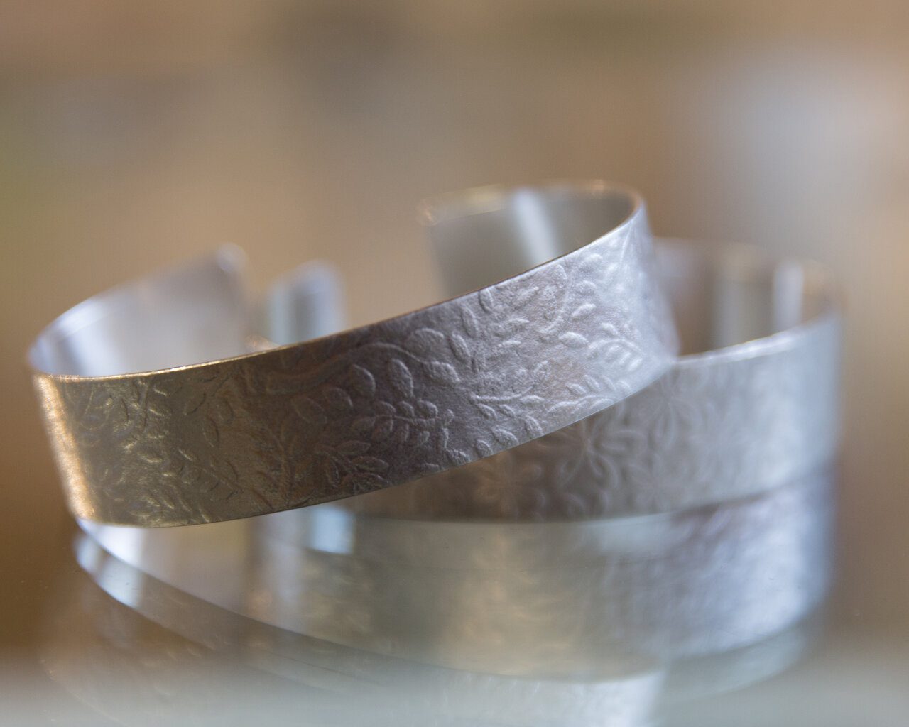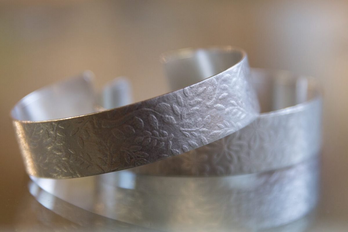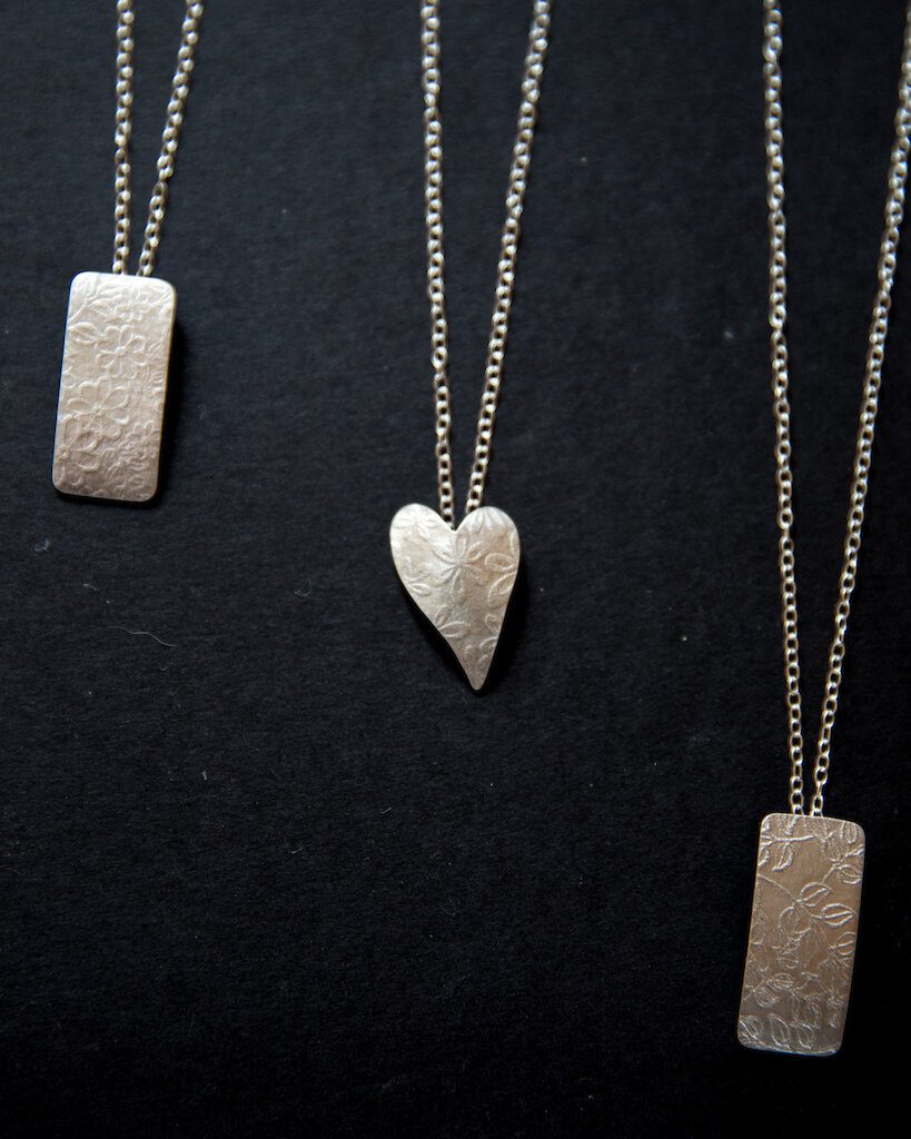 The textures used in her Watercolour Collection began as watercolour and pen and ink sketches. They were then transferred to the computer and arranged into repeat patterns before being engraved into card using a laser. These patterned cards and sheets of silver are then sent through tight heavy steel rollers allowing the pattern to become embossed in to the silver. From sketch book to silver and gold, creating beautiful jewellery just for you! Each piece of jewellery is unique due to the placement of the pattern.