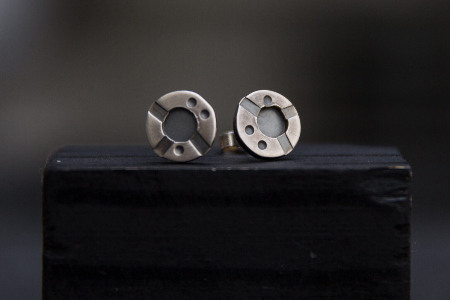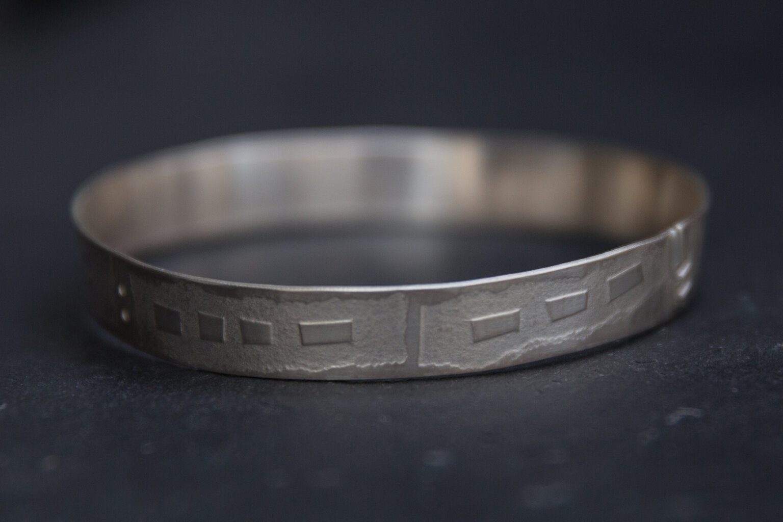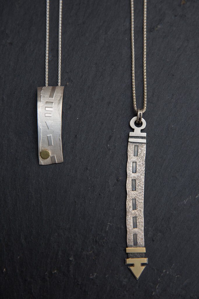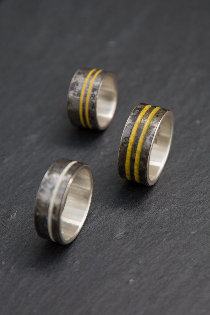 He writes, “The main inspirations for my work are abstract symbols, such as road markings, and a keen interest I have in the reactions of 3D media to applied processes. I utilise these material reactions, in combination with abstract symbols and pattern, to create jewellery and other forms of design work which are sophisticated, refined and well made.“