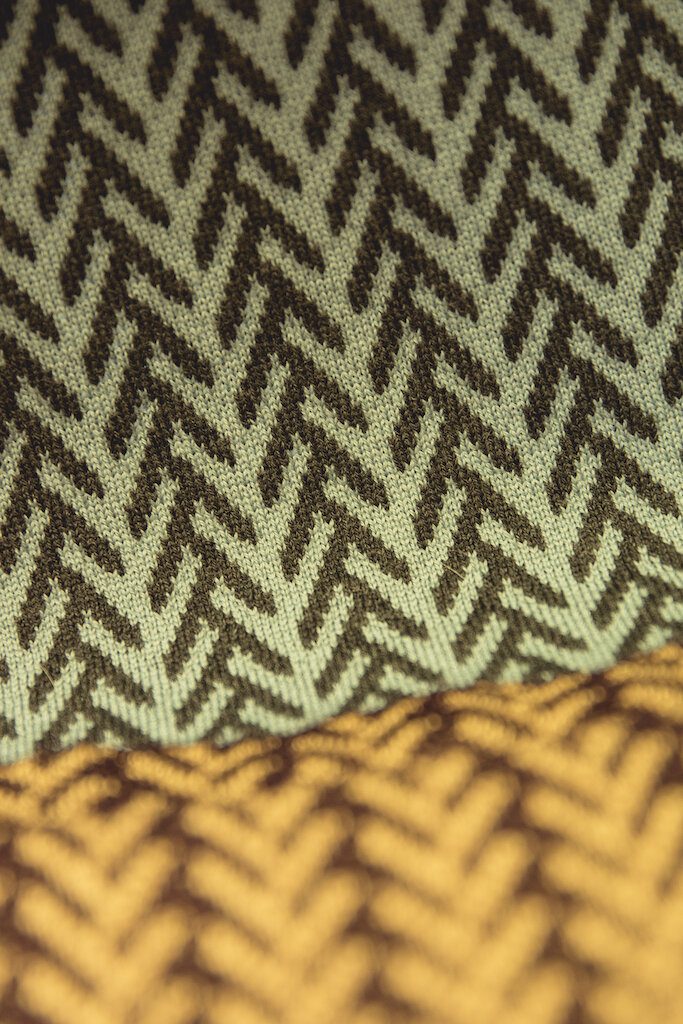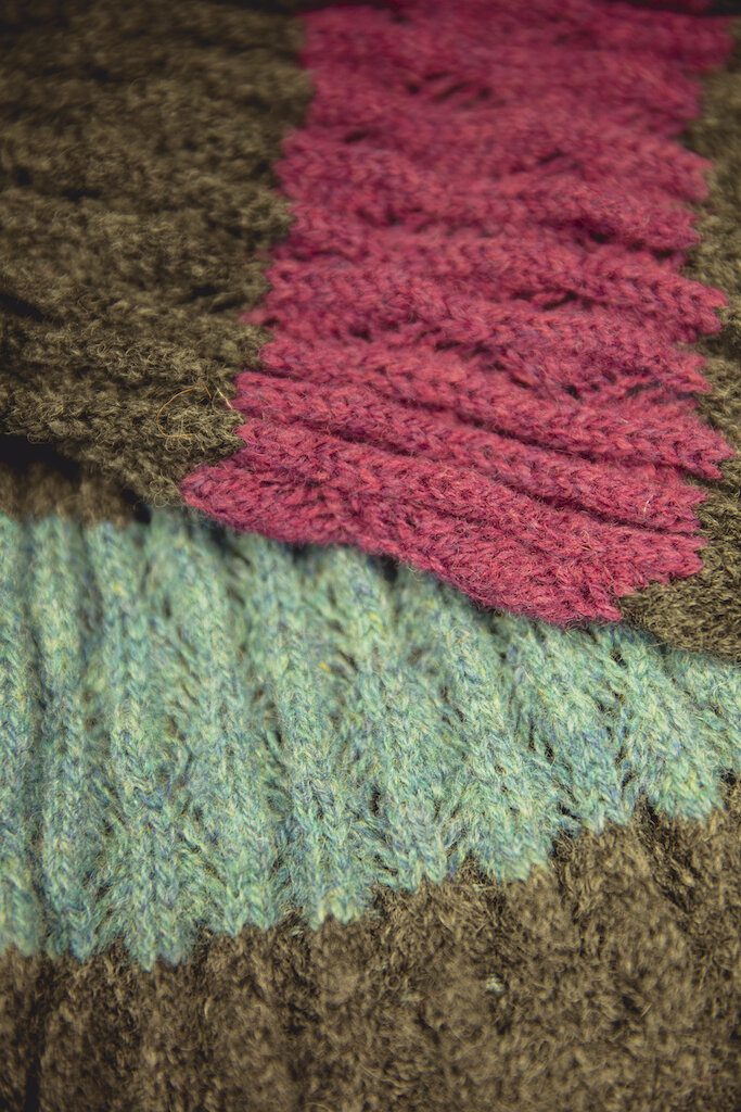 Recently she has introduced another collection ‘Print o da Wave’, which is based on a traditional Shetland knitting pattern. She has enjoyed experimenting with the design in various fibres, from Shetland wool to Merin,o to create a colourful, diverse range of textiles. This design has also been progressed in the form of a double layered reversible merino which Hannah calls ‘Jaquard Print o da Wave’.