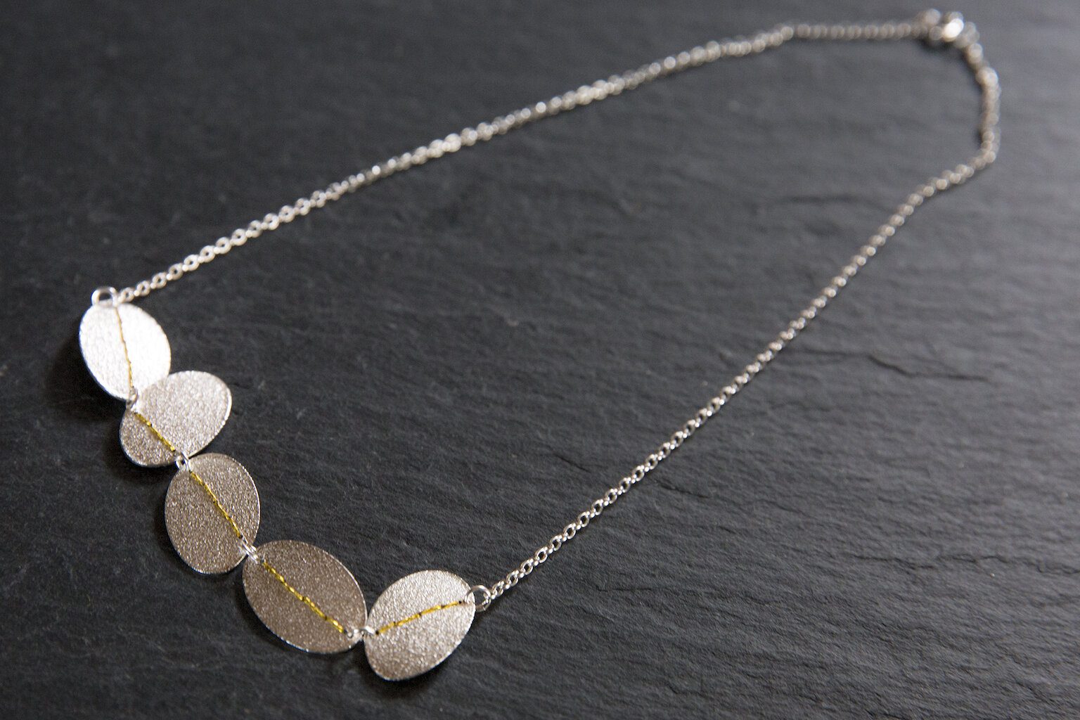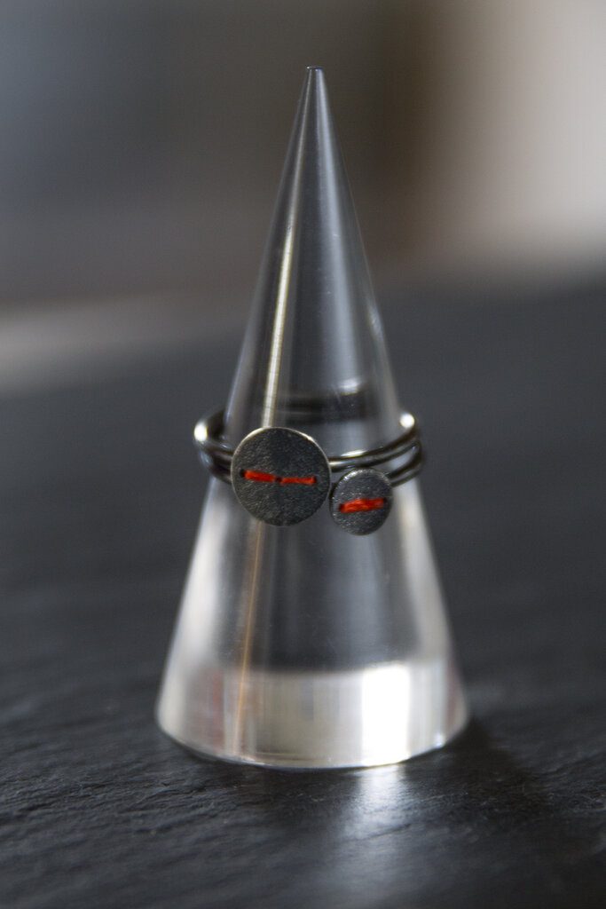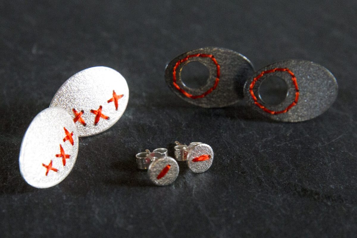 The silver discs are embossed with a sandpaper texture, created using traditional techniques. The end result is a study of line and form, with soft subtle textures in contrast with the use of bright bold thread, creating beautiful contemporary pieces.