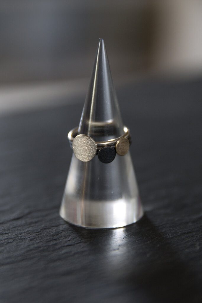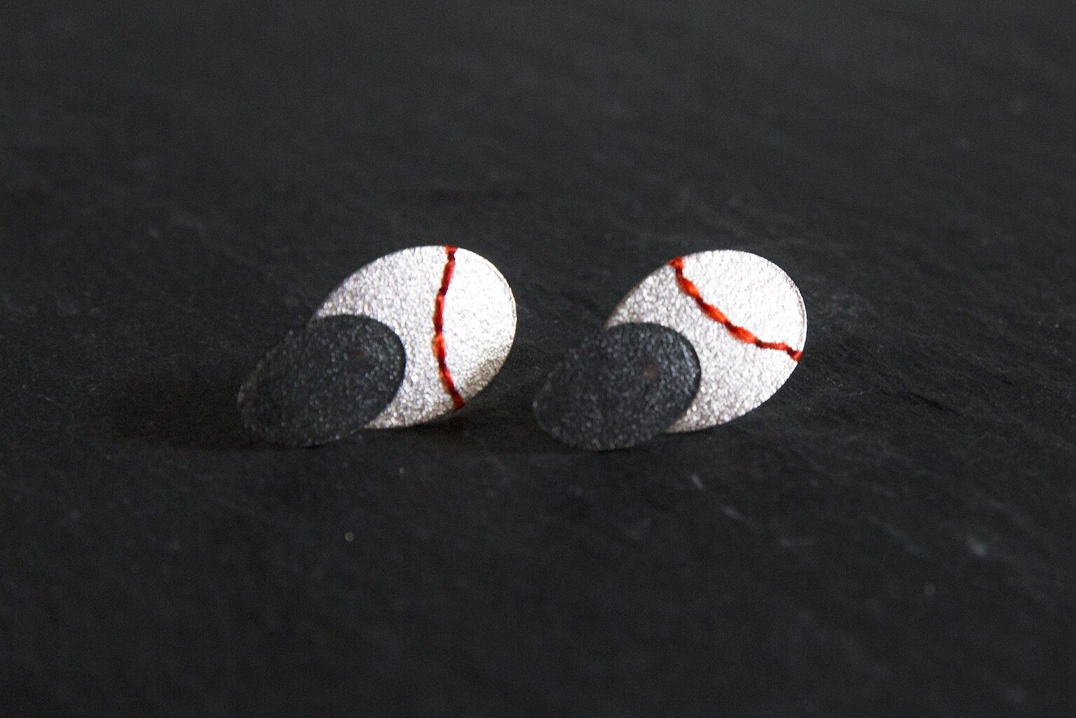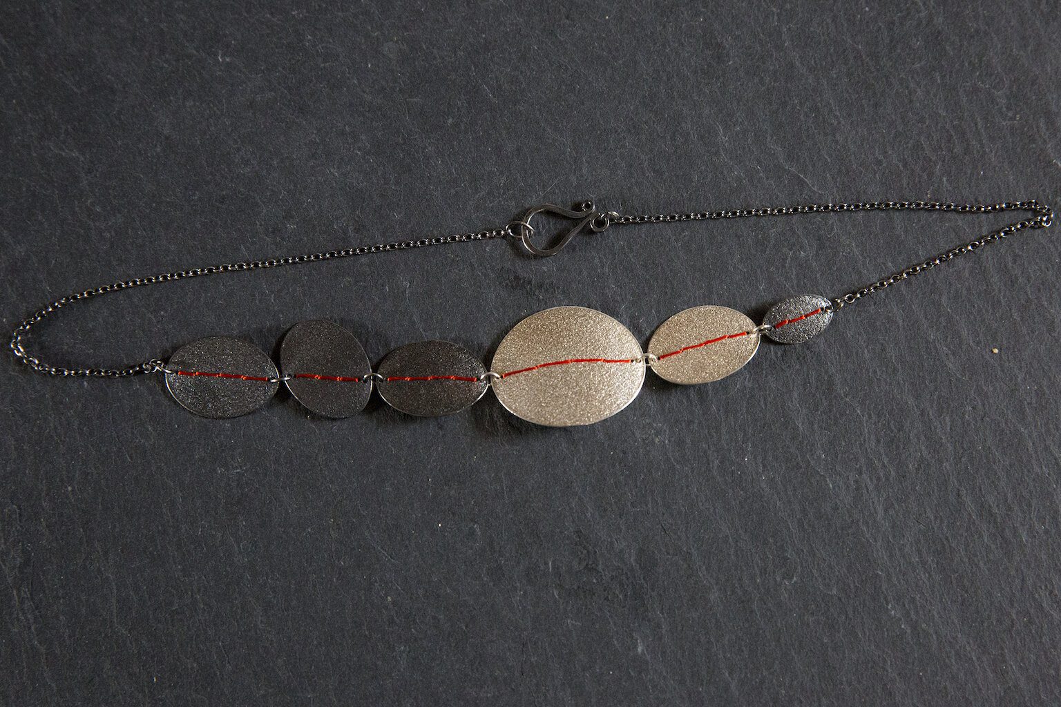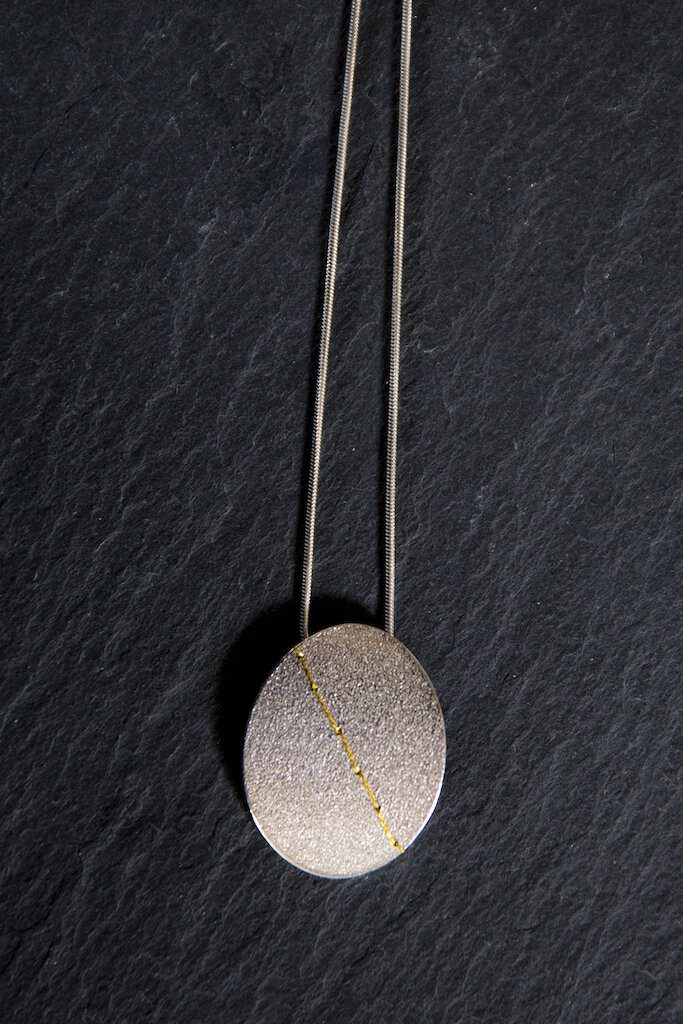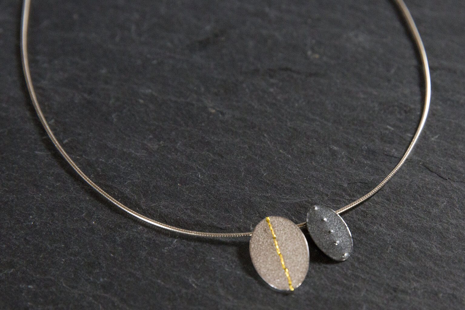 Her work is mainly in sterling silver but uses small touches of gold and gold plating. She writes: “I love the versatility of silver, how such a strong unyielding material can be manipulated in so many ways into so many different forms. I often oxidise parts of my work for contrast and add texture using various hammer strokes and by rolling with different materials. The inspiration for the Sewn-Up collection came from a basketful of embroidery threads purchased at a charity shop, so many colours and textures I wanted to incorporate them into my jewellery. I also collect beach pebbles, in particular the pebbles with a white line of quartz running through them; the Sewn-Up collection was the outcome of these two ideas, pebble shaped pieces with coloured quartz stitches.”