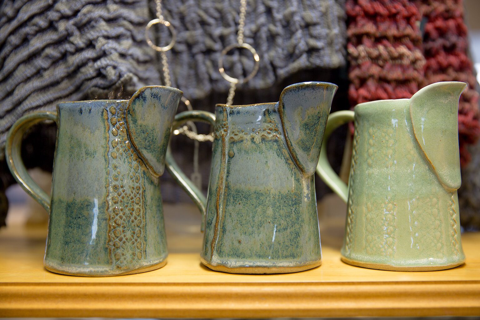 She says: “Throughout time women who lived and work on the land have been resourceful and resilient. They have brought up families, tended crops, cared for animals, raised peats, etc and kept the home. And all the while makkin knitted garments, to sell or exchange for goods. What inspires my work is the idea of what brought these hardworking Shetland women joy, and what beauty did they find in everyday objects? Was the raised design on the tea caddy or the shape of the milk jug pleasing? Did the special lace edged handkerchief that belonged to Granny, or the Sunday linen cloth bring a smile? I am drawn to these everyday treasures and to the story they tell. My work is a celebration of the extraordinary lives of ordinary folk. The lace textures and designs in my work are my way of reflecting the extraordinary lives of these ordinary women of the past.”
