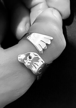 My wildlife wrap around rings are my favourite thing to make as each one is made from a single piece of Silver and there is no soldering involved. Although they do still go through seven processes. I love making them as they are stylised versions of iconic Shetland wildlife – otters, seals and puffins. Each one is slightly different and unique as the hand stamped or hammer decoration varies from piece to piece, giving them their own characters.I made the first version of my wrap around rings – a seahorse as an experiment for myself in 2012. When I wore it folk would comment on it and asked me to make them one. So that’s how this collection was born and I have been making them ever since. The rings are adjustable, durable and comfortable to wear and have proved to be one of my most successful and popular pieces alongside my “Eyeland View” collection of Sliver and enamel pendants.
