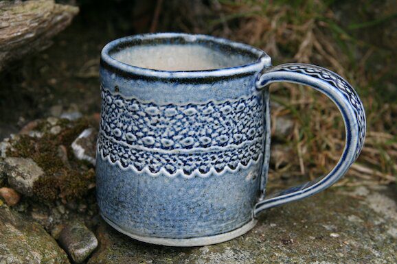 My work is deeply connected to people and place. Most of us do not have expensive heirlooms, but we maybe have a milk jug, a lace hanky, or a pipe, a tushka or a spade that belonged to our loved ones. But most of all we have our memories of the welcome we had when we visited, the smell of baking, the pattern on the china and the wallpaper, the worn feel of Grandads favourite baccy tin. I try to bring these wonderful reminiscences to life through the shapes of the vessels I make and the textures I roll into the clay. I work on a plaster mould of antique textured wallpaper and use treasured lace, handmade clay stamps and knitting to signify and represent the uniqueness of the people who loved us.