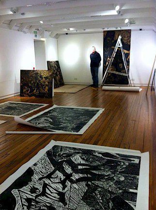 Paul Bloomer in Bonhoga Gallery hanging his current exhibition