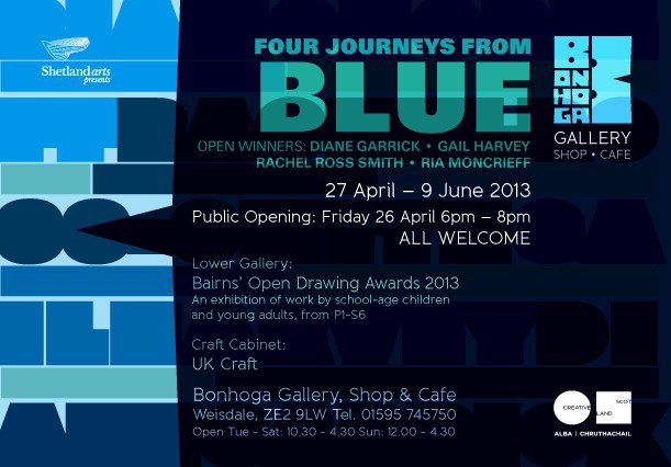 Everyone is invited to attend the free public exhibition opening of Four Journeys From Blue on Friday 26 April, 6-8pm, at Bonhoga Gallery.