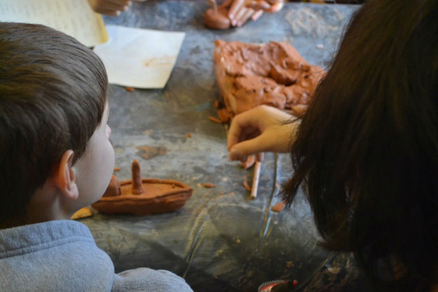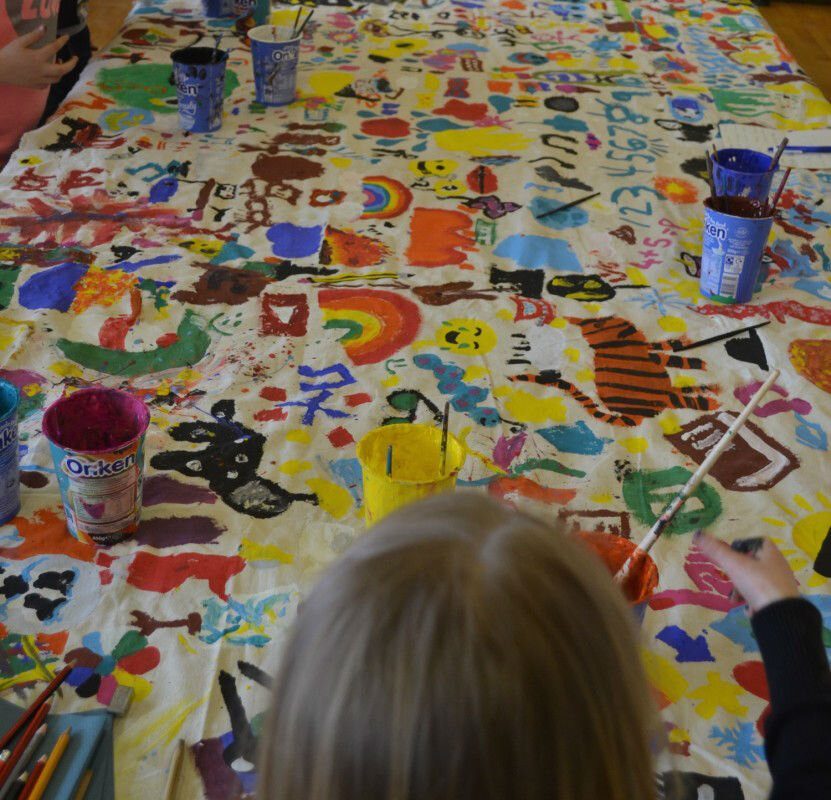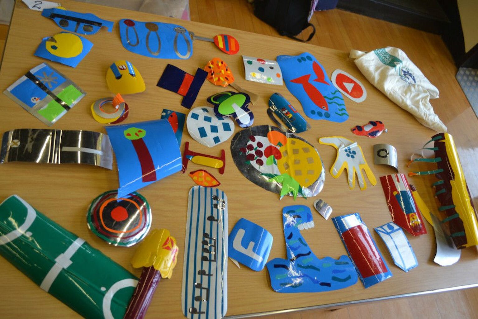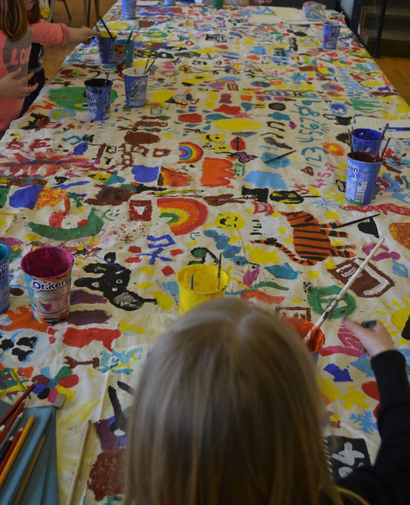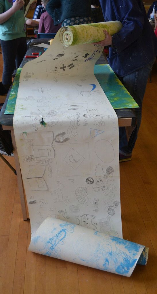 We have been to all the participating schools now for the first round of workshops. Sandwick finished off the last of the clay, and the canvas is full. The huge print is complete and we have a wall’s worth of vinyl collage. The next step begins over the next 10 days. We will take something someone has made and transform it into a different medium. All of these objects and images that have been made will be starting point for a new artwork.