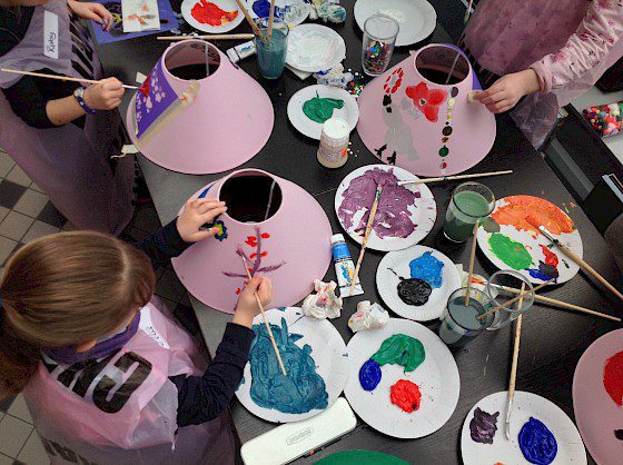 Bonhoga Gallery held a very successful and fun children’s lampshade painting workshop in the gallery café on Saturday, 26th of October, 2013. The workshop was inspired by the artwork of Barbara and Wilma Cluness as displayed in the recent Variorum exhibition. Several talented young people attended and created some lovely, colourful designs.