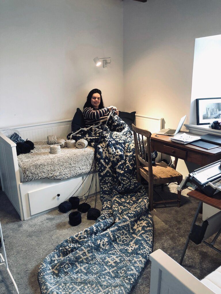 Hand knitting 27 Shades of Shetland blues took me quite a lot of time, at first it was quite transportable so I got to take it with me and be able to knit from different spaces, in the house and outdoors.