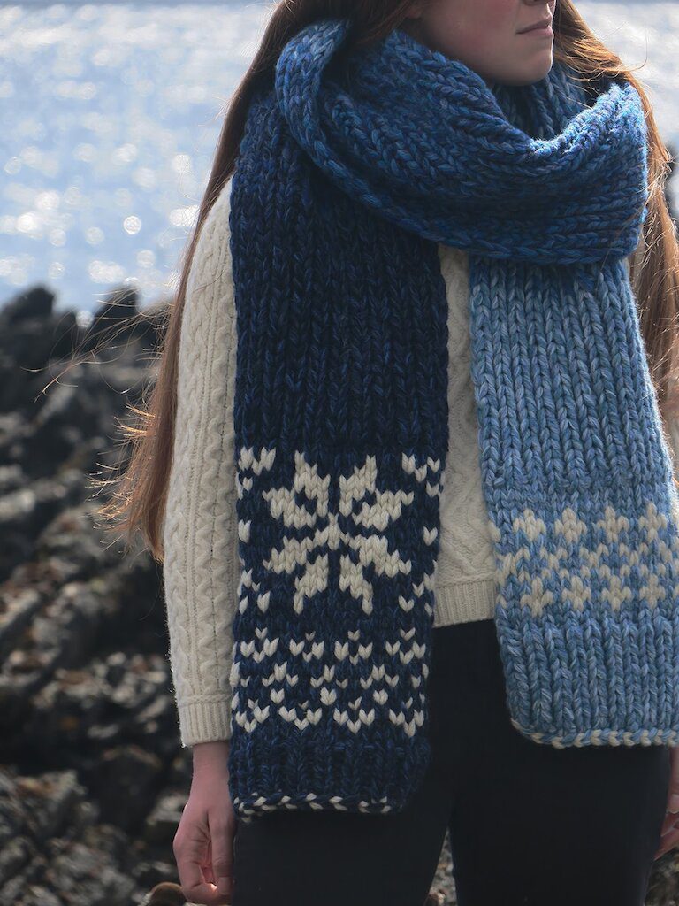 I wanted to use a limited pallet but with a multitude of shades. I love Jamiesons of Shetland wool for several reasons, it is produced and spun in Shetland and it comes in a truly impressive range of colours. It’s a dream for a knitwear designer passionate about shades – the dyes reflect very well the shades of the Shetland landscape. Their range of Blues are particularly beautiful – between sea and sky you get a multitude of tones – and their shades of blues were the obvious choice for the project.