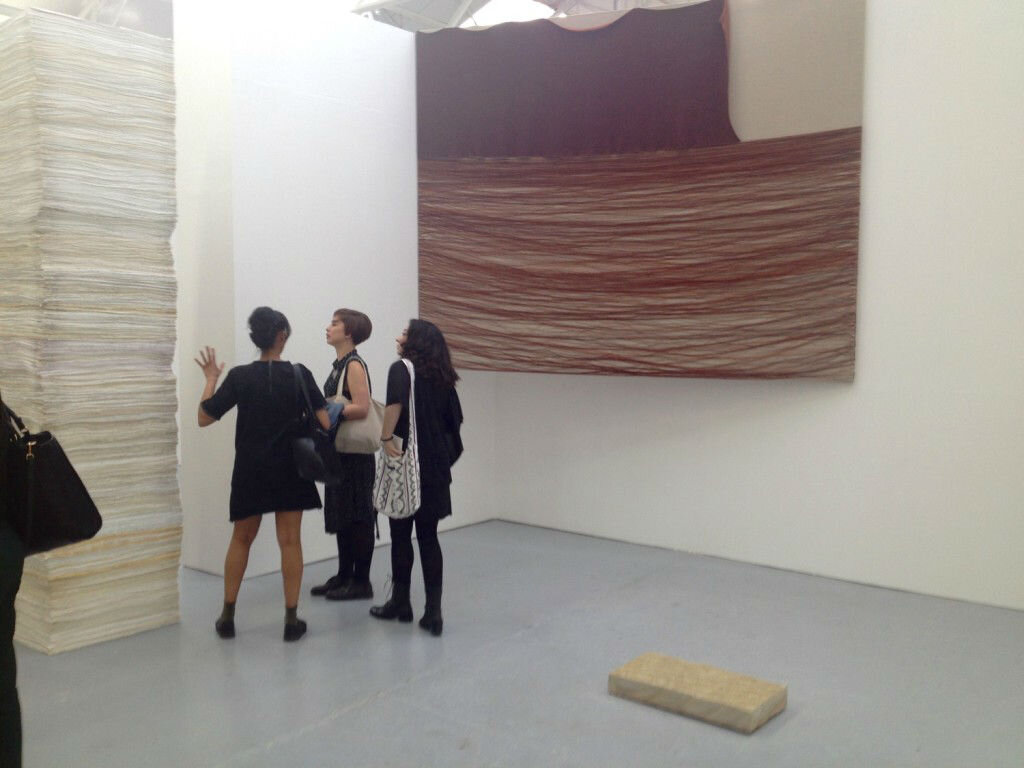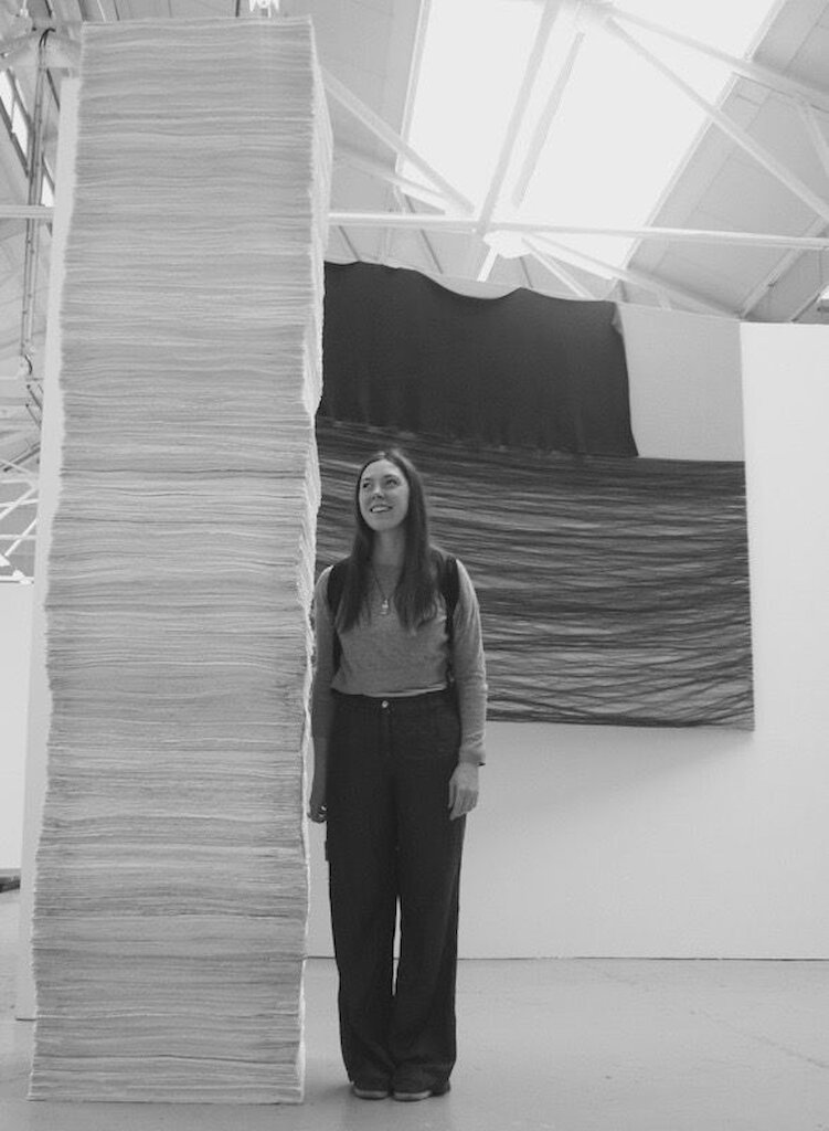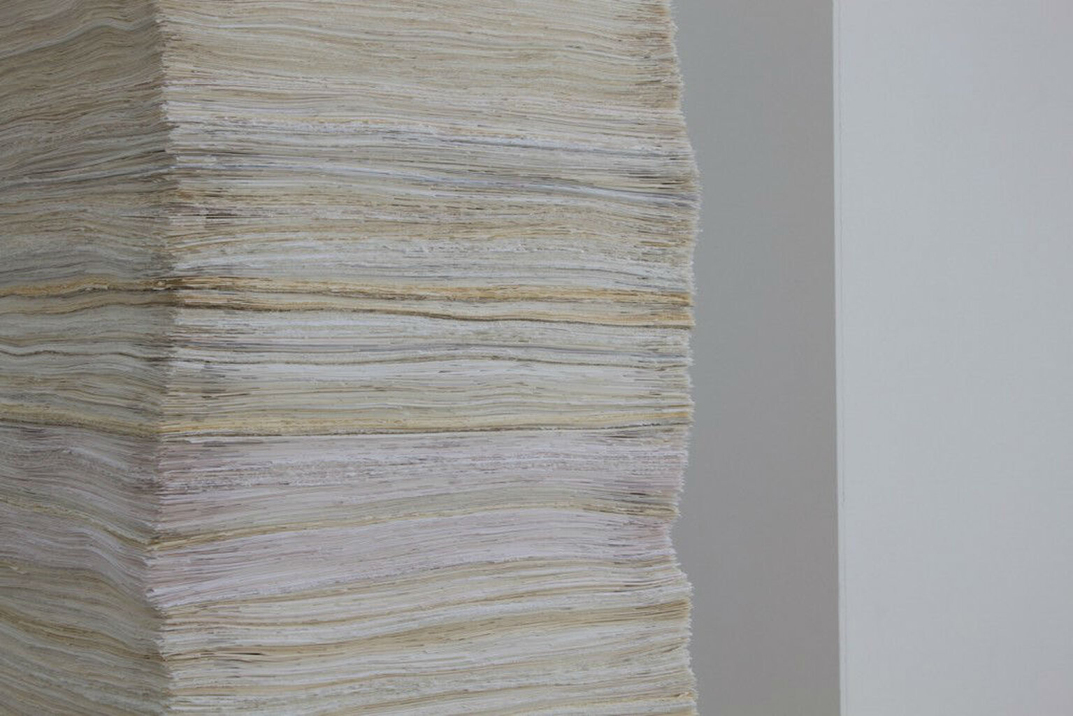 I studied for a Masters in Printmaking at the Royal College of Art in London. Below is a little look at my work from the past year. Although I studied Printmaking as a specialism, it was in the broad context of Fine Art and so I took advantage of the all the departments – from sculpture to textiles to painting. I get my kicks out of making things in mediums I’ve never worked with before – I love to learn about new ways of making. Below you will see my paper sculpture ‘Stack’ thats 3m tall and took 6 months to make. The painting on the wall behind is 2.4m high and is called ‘knitted cliff’ – the sea is made of the knitted bit unravelled. The stone sculpture is called ‘Cast’ and is made of a fossilised stone thats 130 million years old. I’m really enjoying making objects and images for The Art World – because I have never made such an immersive layered artwork before and I have never collaborated with so many people. I can’t wait to set the exhibition up and see how everybody’s hard work comes together.