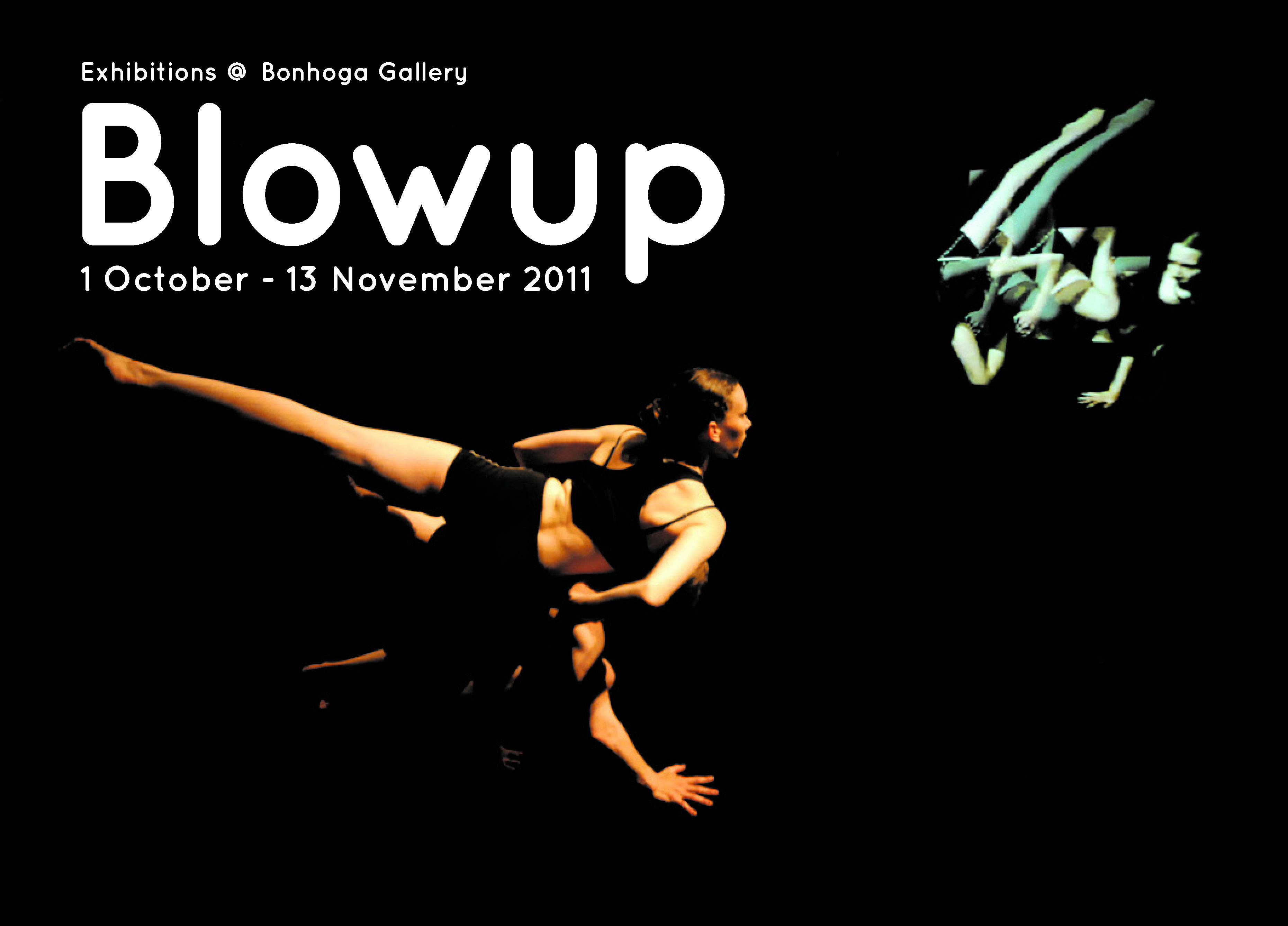 ‘Blowup’ is an interactive performance environment designed for choreographed performances and public interaction. The work consists of two large video projections in which video imagery of the performers or viewers is manipulated in real-time. These images are cut up, redistributed and distorted by the software so that parts of the body are projected larger or smaller than others depending on how fast they are moving.