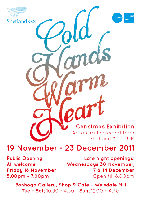 Weather-dependent, the Gallery will be open again at the usual times with our Christmas exhibition: "Cold Hands Warm Heart" - art and craft selected from Shetland and the UK: on Saturday or Sunday 10th/11th December.