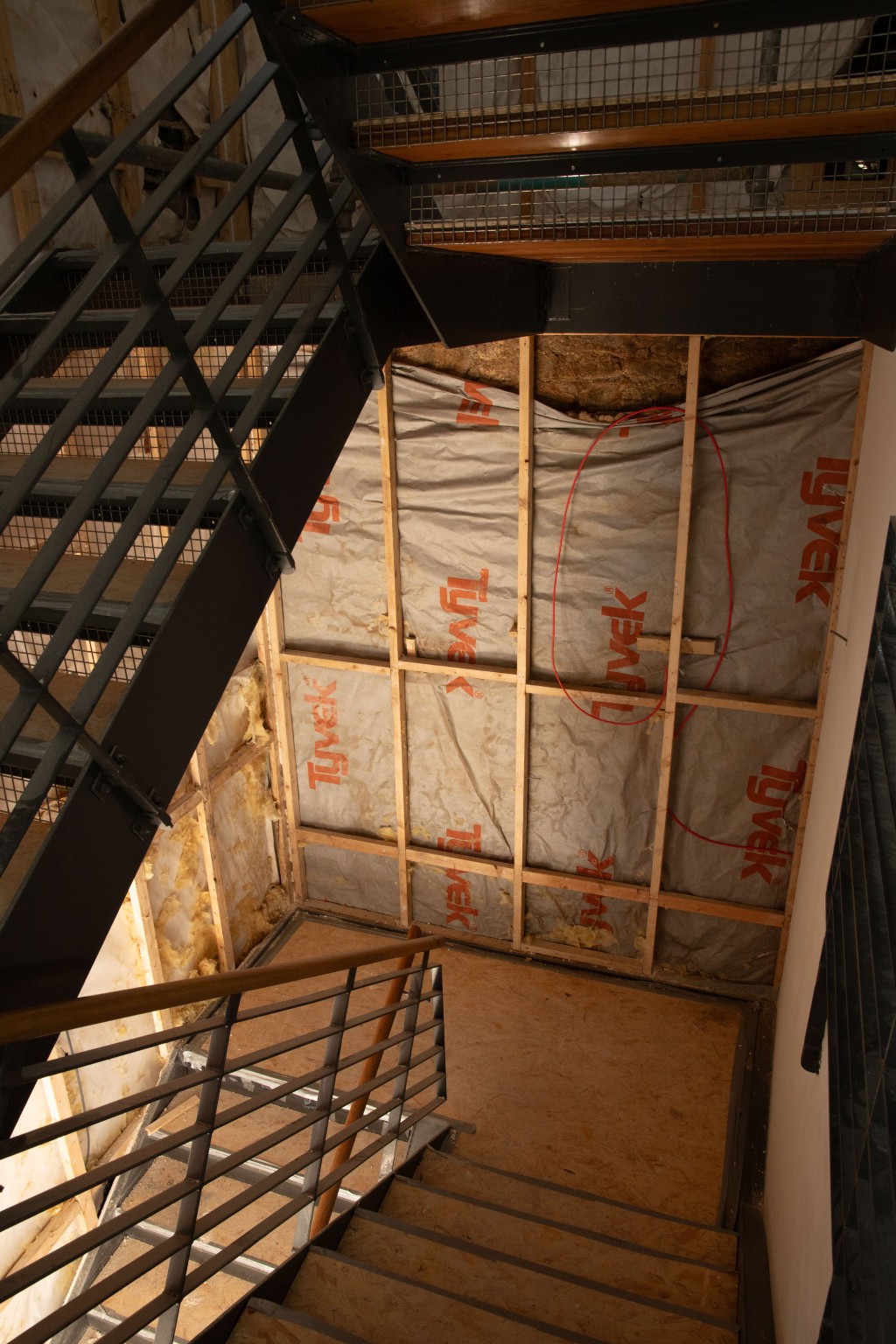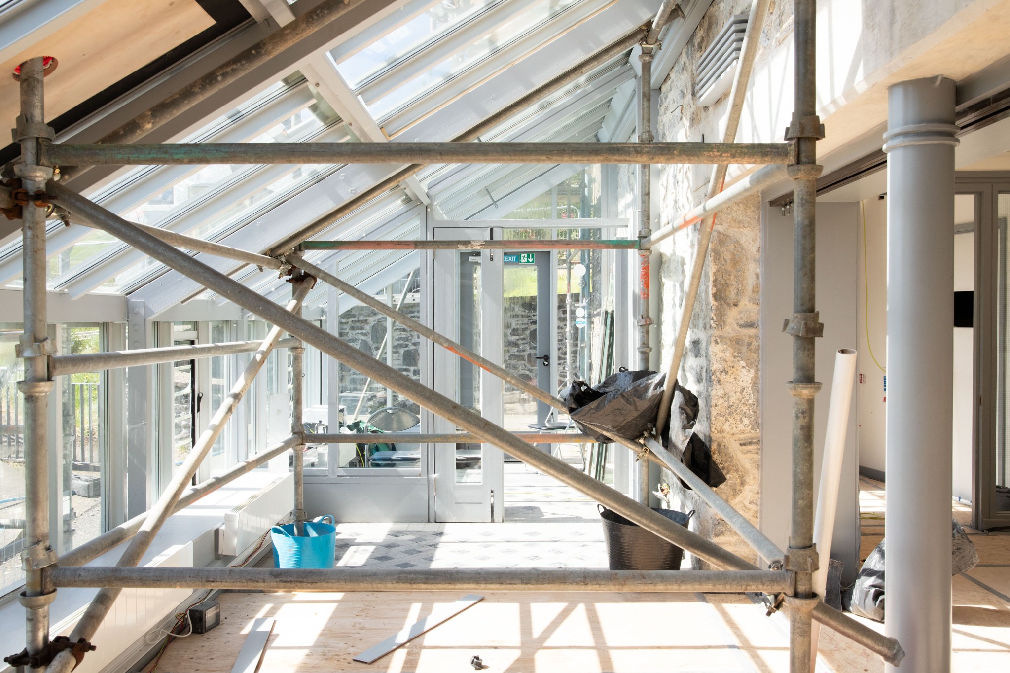 It's a bit bizarre to see Bonhoga covered in scaffolding (inside and out), the walls all stripped back to the bare bones, wooden flooring removed. The roof tiles are currently being replaced, as are the windows. Speaking of which, the windows in the gallery caused a bit of confusion for the builders - have you ever noticed that the number on the outside doesn't always match the number on the inside? This is because depending on which exhibition was using the space, we could cover or reveal as many windows as needed for the right amount of lighting! Our previous Maintenance Technician Angus was a whizz at coming up with solutions on how to do this, to make it hardly noticeable.