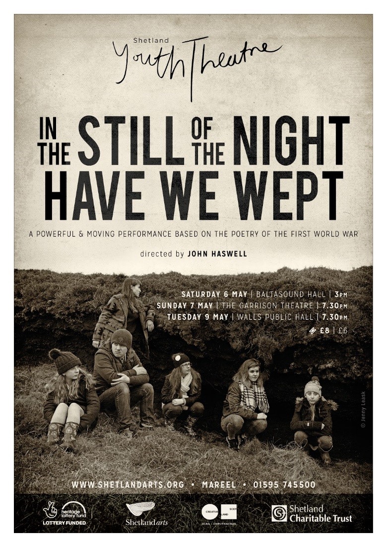 “Shetland Youth Theatre, with the visionary stewardship, direction and research of John Haswell and his team have produced something memorable… the poetry of those who went through the experience of the trenches, as well as those left to worry on the homefront, was hauntingly brought to life with powerful and intense emotion. This performance won’t be forgotten by any who witnessed it. Director Haswell and the youth of Shetland have put together a remarkable performance, which is timeless and emotive. The personal expressions of those from home who experienced war have been brought back to life; driven by a special young cast who breathed every single emotion of those words.”