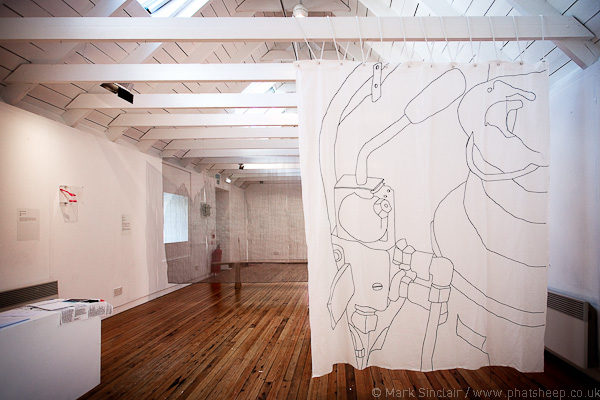 The current exhibition at Shetland Arts’ Bonhoga Gallery is “Portage: textiles, extremes of scale.“ The exhibition is about contemporary textiles- we are all experts in textiles. From birth we have slept in them, worn them, sat on them and at this time of year we draw them together over windows to banish the cold and dark of winter.