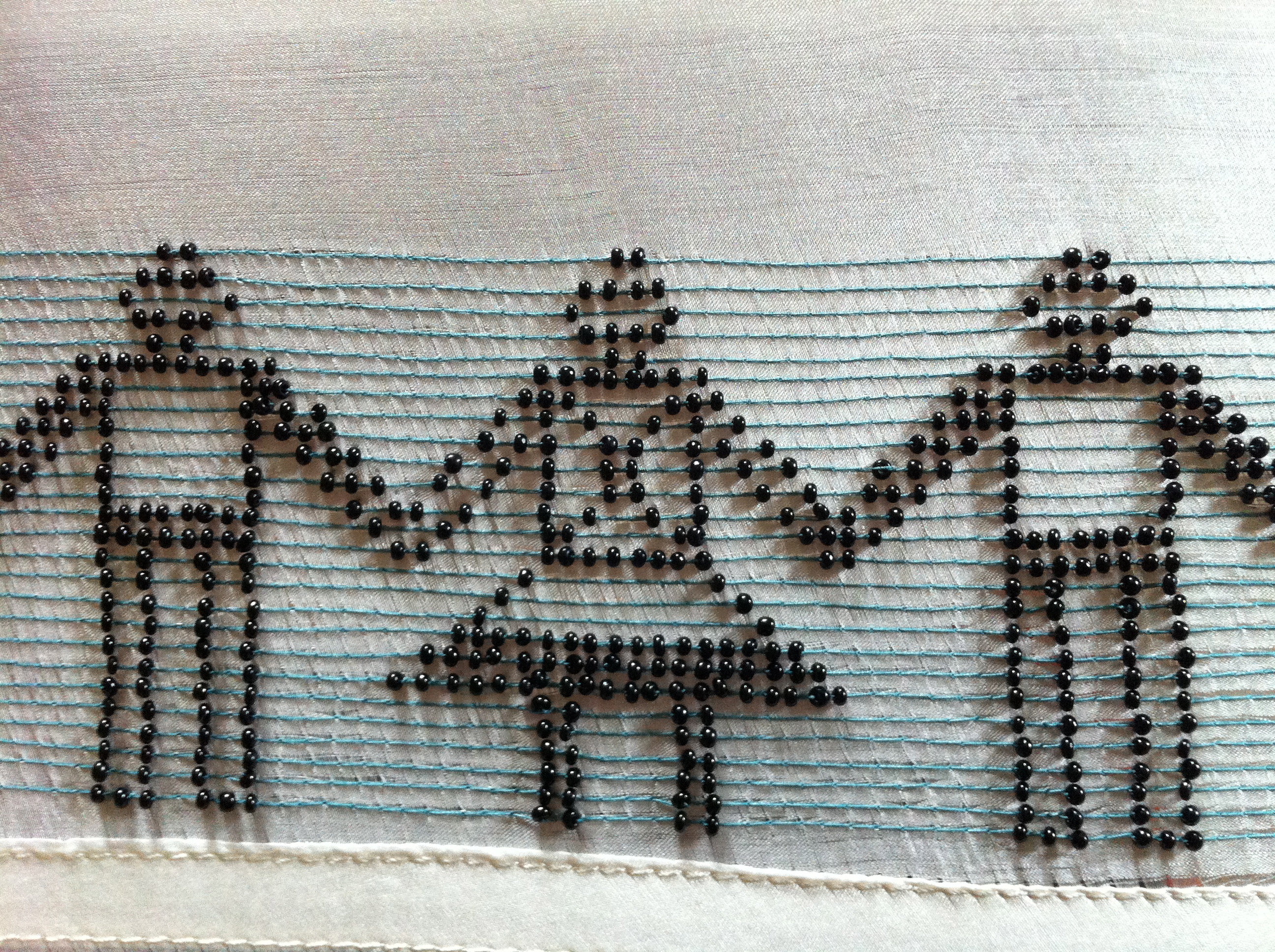 Of the work in her exhibition Jen explains, “I have created a narrative, a visual story, a love story using the feminine medium of textiles but speaking of fishing, man and the sea. I have made a series of bed-jackets, stockings and knickers mainly using haute couture embroidery, traditional embroidery, hand screen-printing, digital printing, silk painting and hand dying techniques.”
