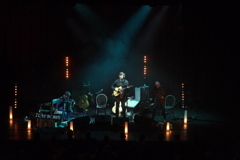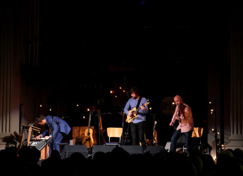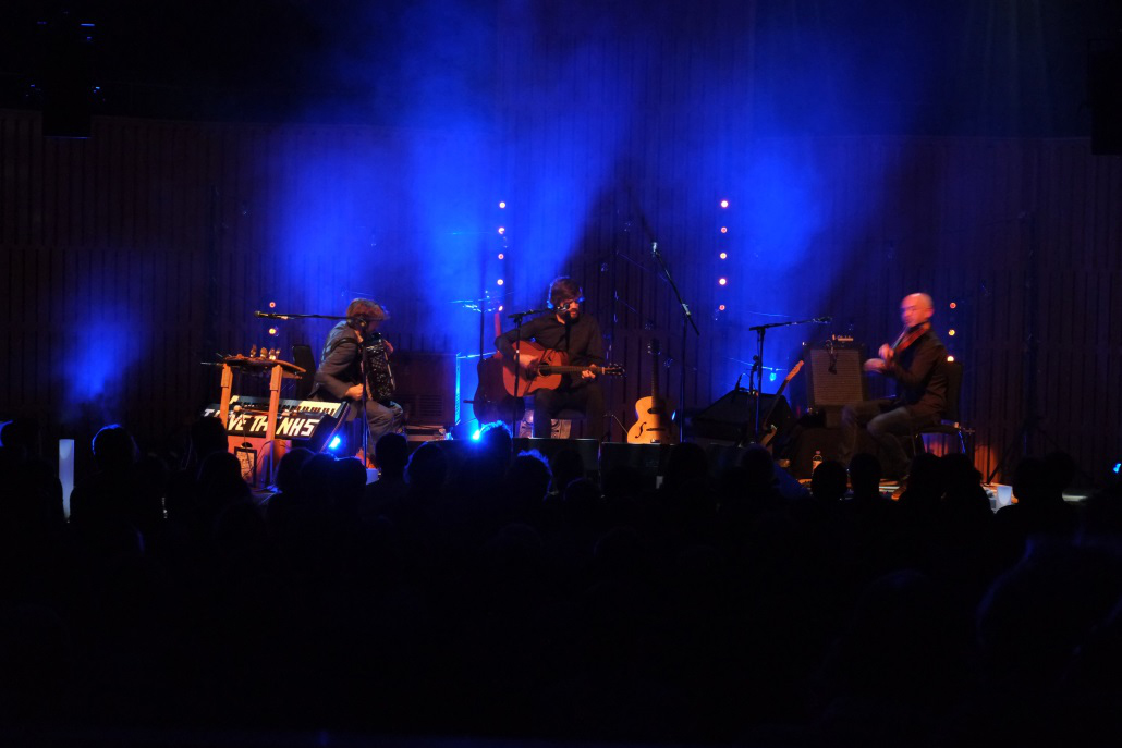 Tonight we are in the Howard Assembly rooms in Leeds. This in one of those buildings that has an old theatre with a new bit of cool architecture built onto it. The room we are in is full of light-coloured wood and is acoustically designed to sound good. And it does. Ben is with us again and makes it look beautiful and occasionally epic.