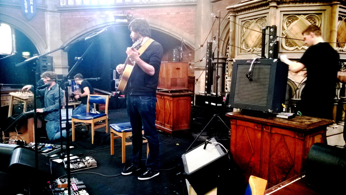 So… we arrive at 12:00, set up and soundcheck Lau. The Elysians are already there rehearsing in the vestry and once they are also soundchecked we spend the rest of the afternoon in rehearsals. As well as remembering how to play the complex piece of music there are technical considerations involved with Martin taking the sound of the quartet and manipulating it in real time through his boxes with knobs and buttons.