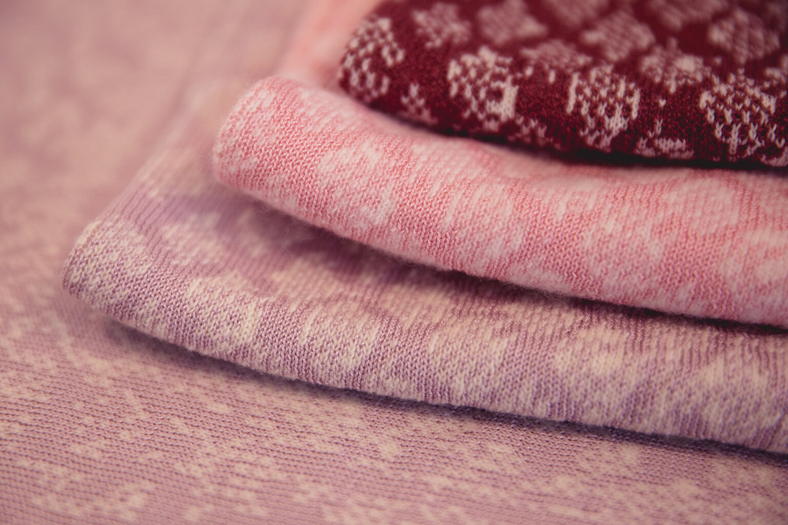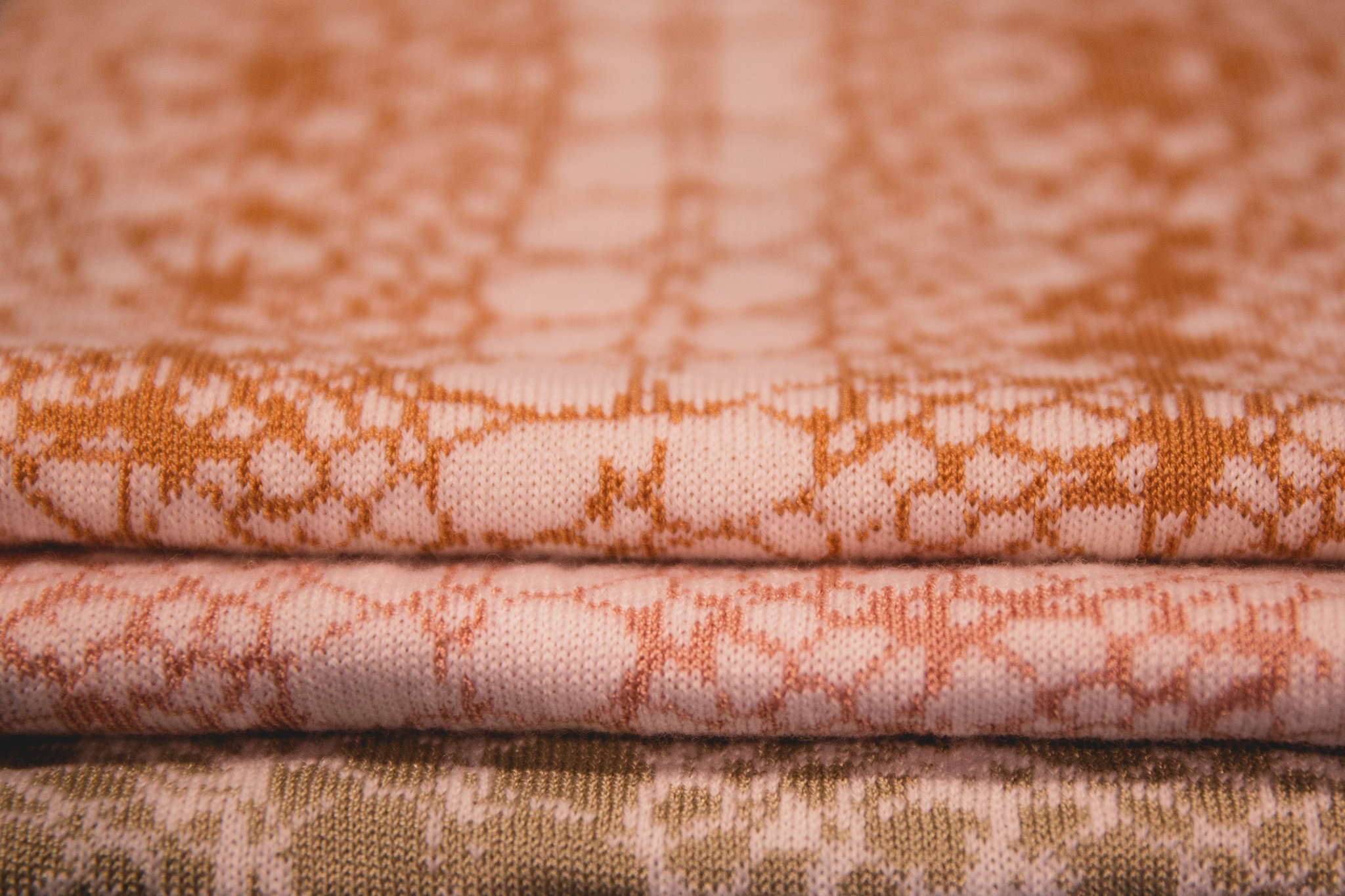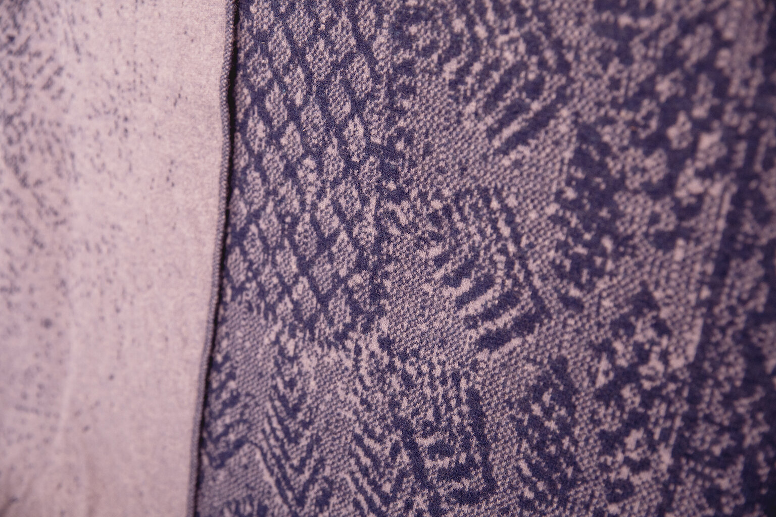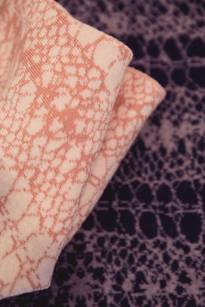 In my own textile work last year, at the Shetland College, UHI, I researched Shetland lace knitting with a focus on my heritage. I was eager to use the lace patterning of a hap, but knitting lace by hand is time consuming and demands perfection, in addition to needing focus and concentration. I was looking for some way to catch the essence of a traditional hap by using machine knitting, wanting to connect my work with my mother’s work. In the design, parts of the pattern are erased and chaotic leaving untidy empty spaces, trying to reflect how dementia takes over, disorders and vacates. The blanket pattern fades away as it moves towards the top edge, suggesting the passing of time. Essential criteria for me was that the blanket was soft, the tactile element was just as important as the pattern design – 'hap' is a Shetland word for shawl, from the word haptic, “to wrap, also relating to the sense of touch”. I experimented with different fibres and washed the blankets until I achieved a suitably soft tactile feel."