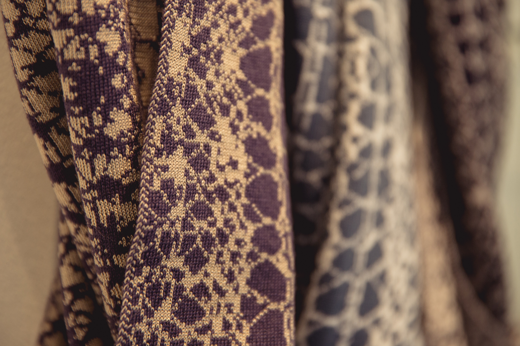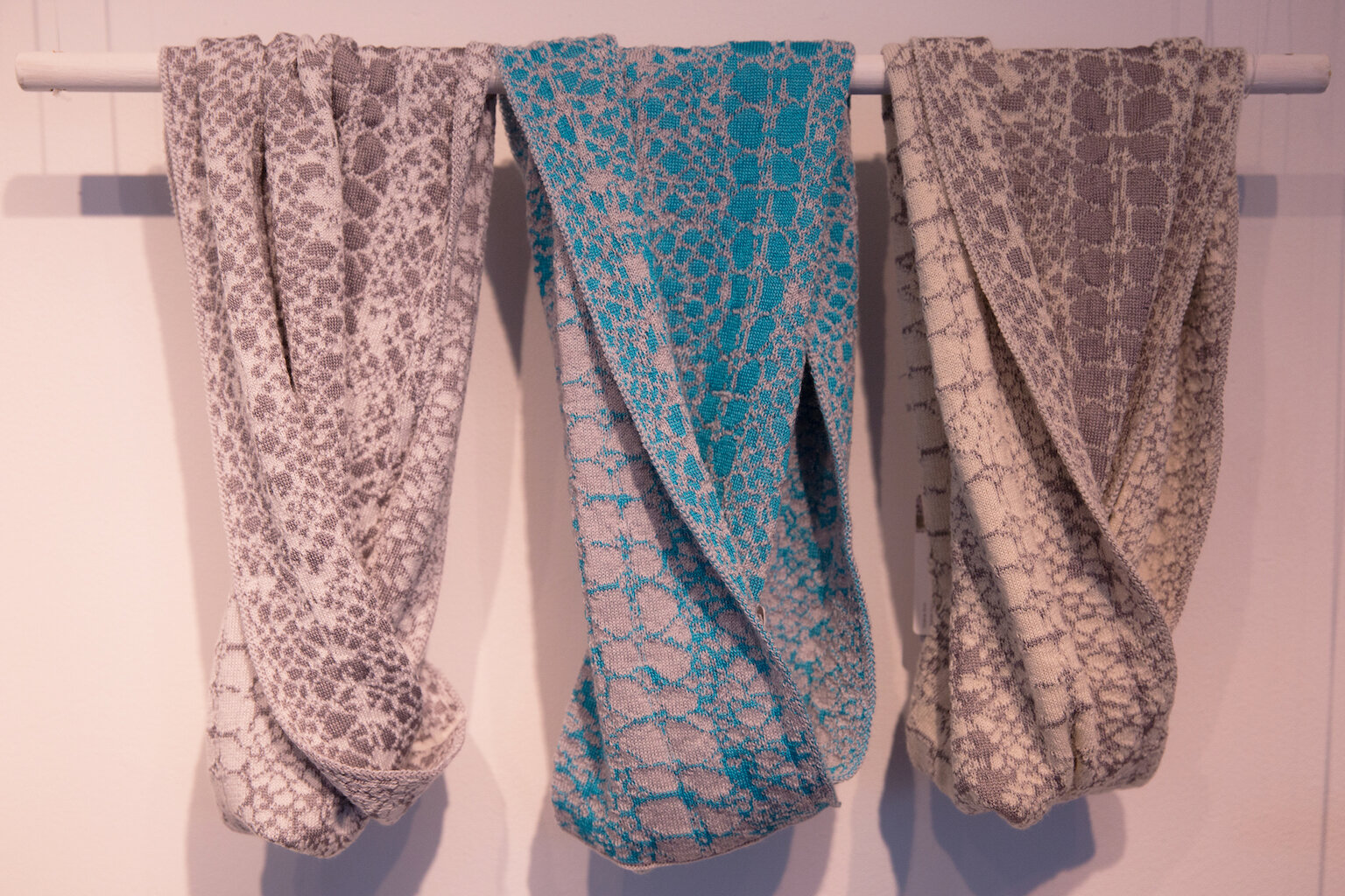 Local designer Elaine Nicholson developed her collection of beautiful cowls and blankets while studying Contemporary Textiles at Shetland College. Taking inspiration from her heritage, she taught herself to knit openwork and traditional Shetland lace, and using computer assisted design programs developed patterns for knitting on an industrial knitting machine. These pieces are especially tactile, as Elaine experiments with different yarn mixtures resulting in beautifully soft contemporary textures.