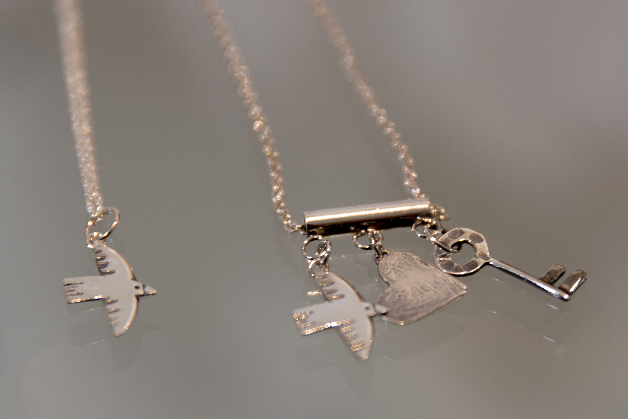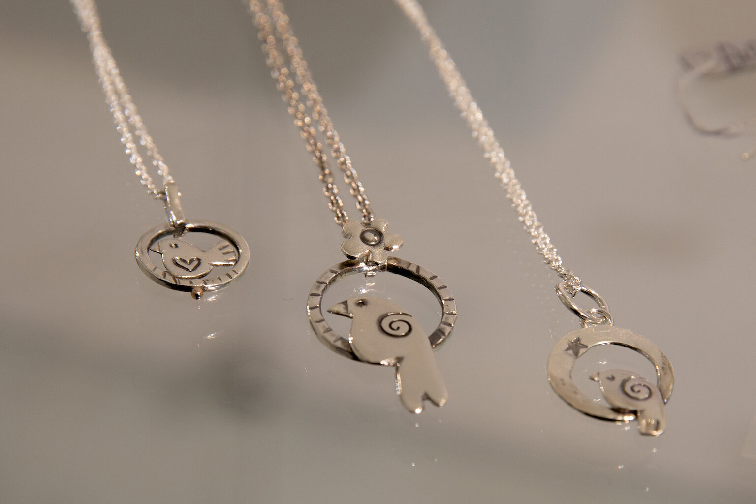 She uses silver to make her jewellery; manipulating the shapes, snipped and sawn from sheet metal, decorating the surface with punches, hammers and files. Much of the silver work is oxidised, then rubbed down in order to bring out the surface marks, in a similar way a printing plate is prepared with ink before going through the press. She has explored a number of different themes and currently garden birds play a big part in her collection. Her work is predominantly figurative and she gets her inspiration from observing and drawing in her garden. Each piece becomes quite individual and the birds take on their own personality and expression.