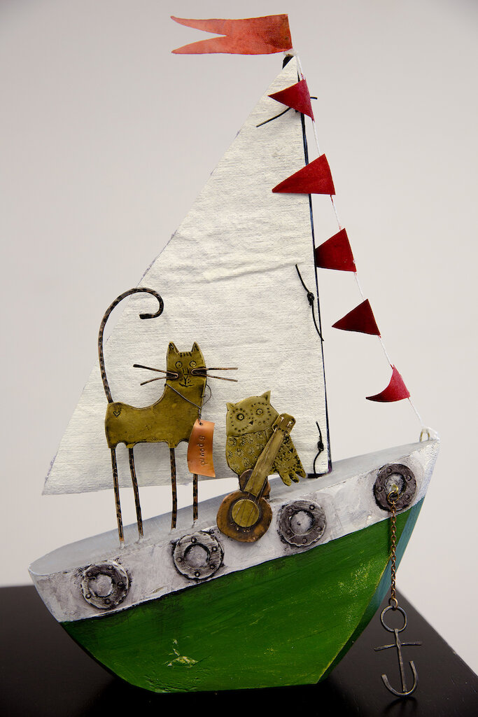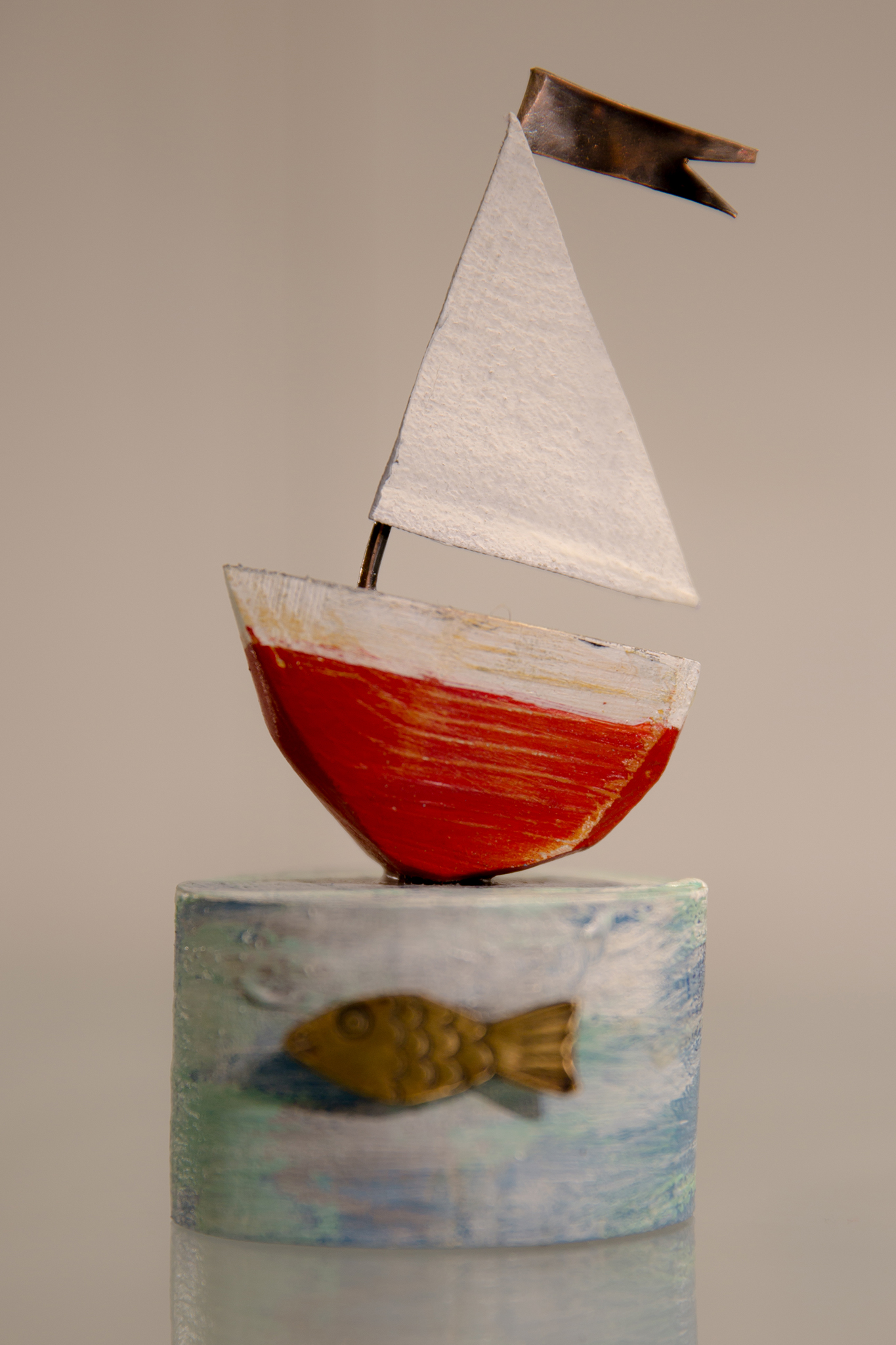 Her sculptural pieces she sees as an extension and combination of her jewellery and print techniques. She also likes to experiment with scale so her birds and gulls are larger than the boat or tree they occupy. Most of her sculptures have integral wooden parts, especially the boats and trees. She spends an equal amount of time sawing and sanding the wooden shapes then applying layer upon layer of paint to build up the coloured surface, then finally sanding it so it looks aged and worn. She hand textures the metal using a rolling mill and hammer. Like the jewellery, each piece is made by hand and has individual decoration and personality.