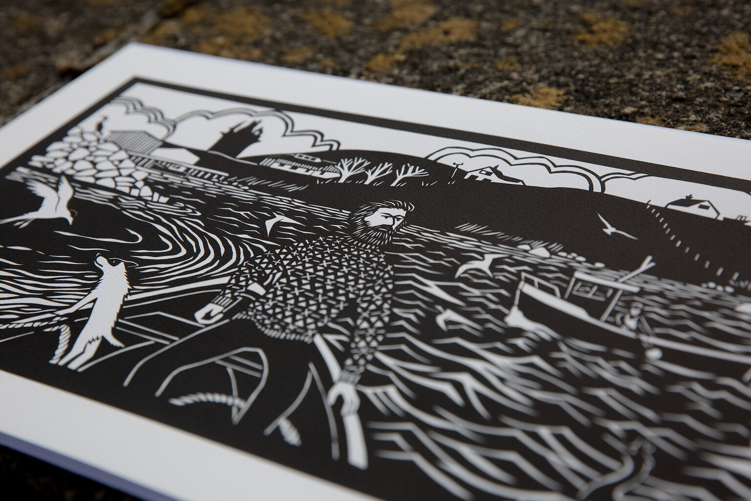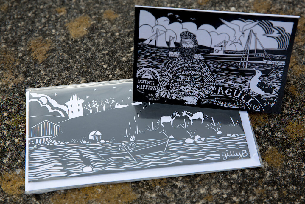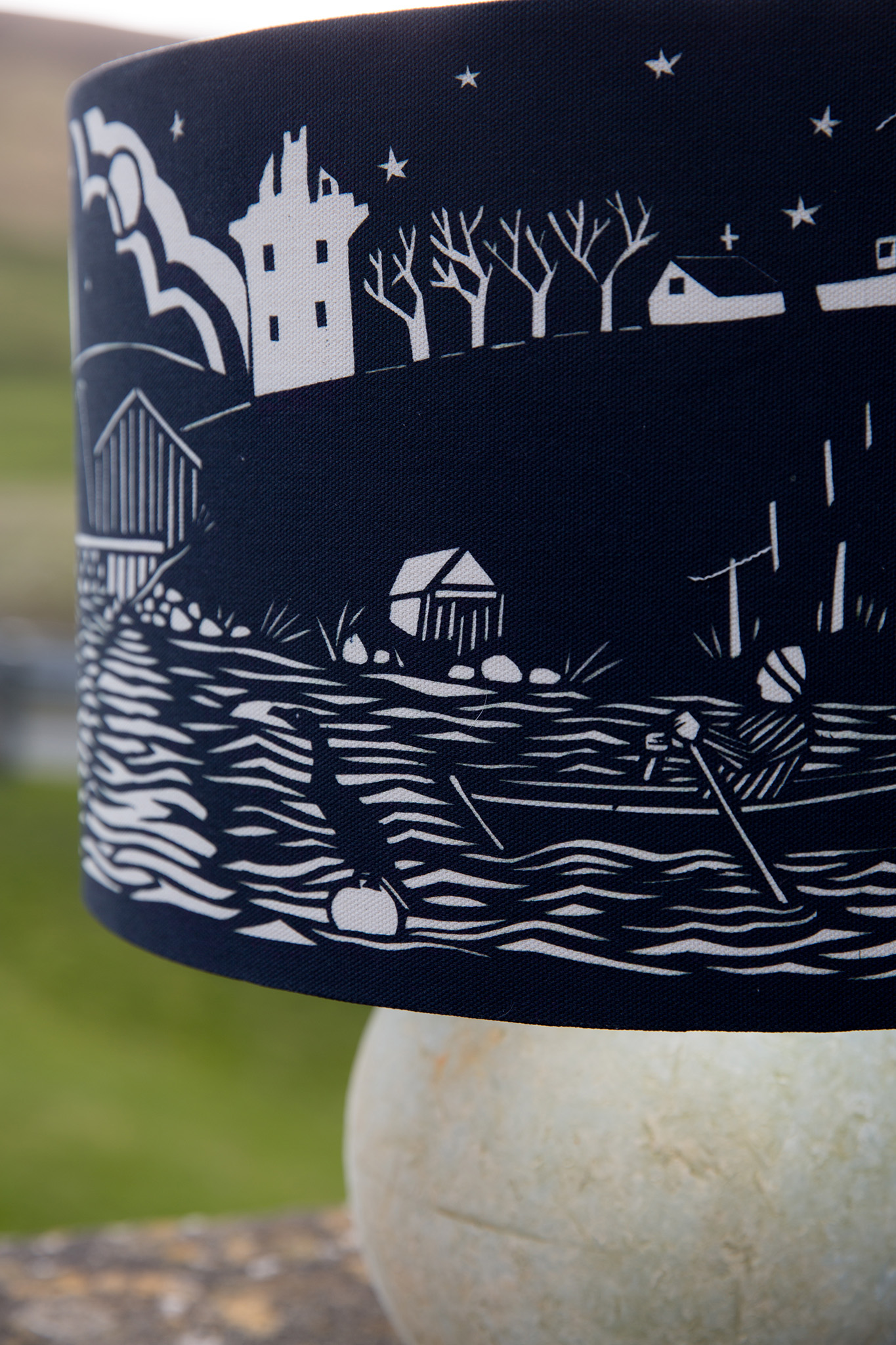 We are delighted to launch Gilly's exclusive new range of prints, greetings cards, tea towels, lamp shades and cushions in the shop and craft cabinets at Bonhoga Gallery. The new designs have been taken from her original paper cut artwork, featuring bold Shetland imagery.