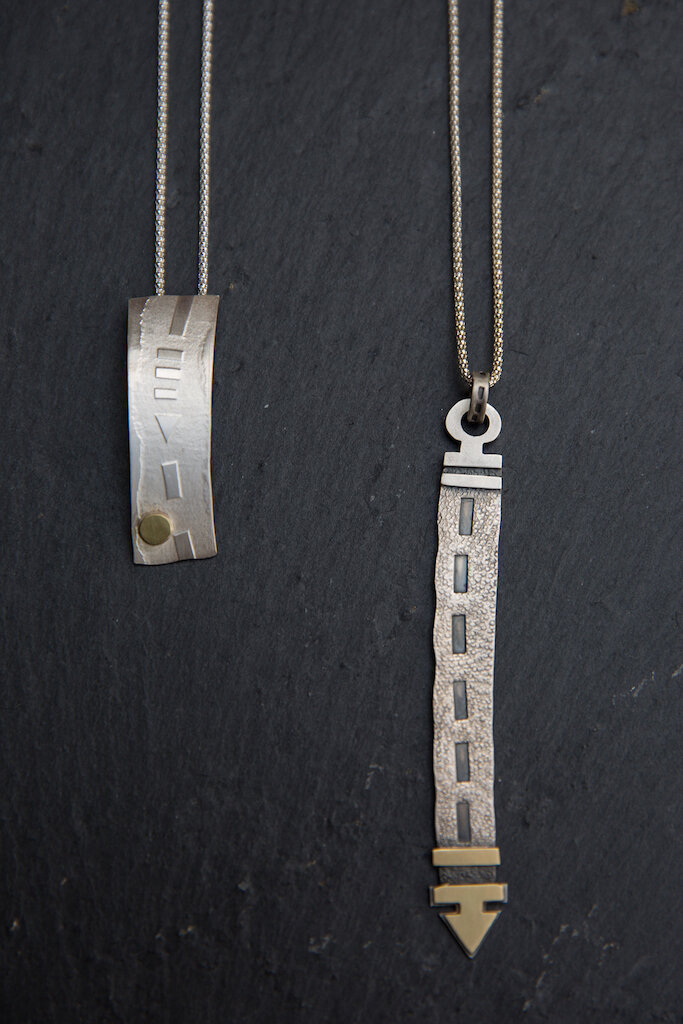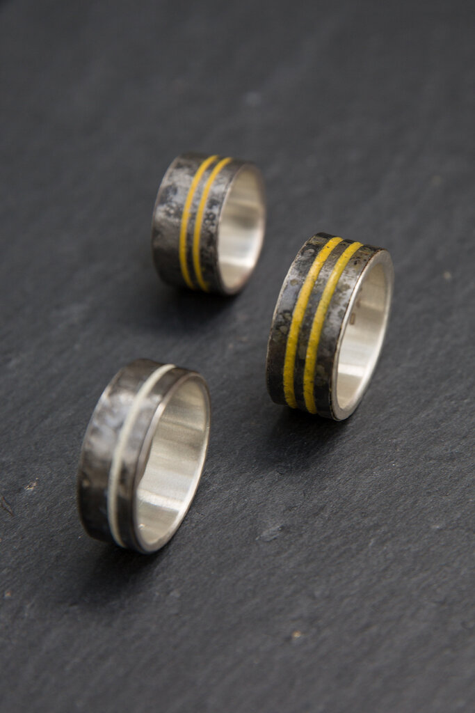 He writes, "The main inspirations for my work are abstract symbols, such as road markings, and a keen interest I have in the reactions of 3D media to applied processes. I utilise these material reactions, in combination with abstract symbols and pattern, to create jewellery and other forms of design work which are sophisticated, refined and well made."
