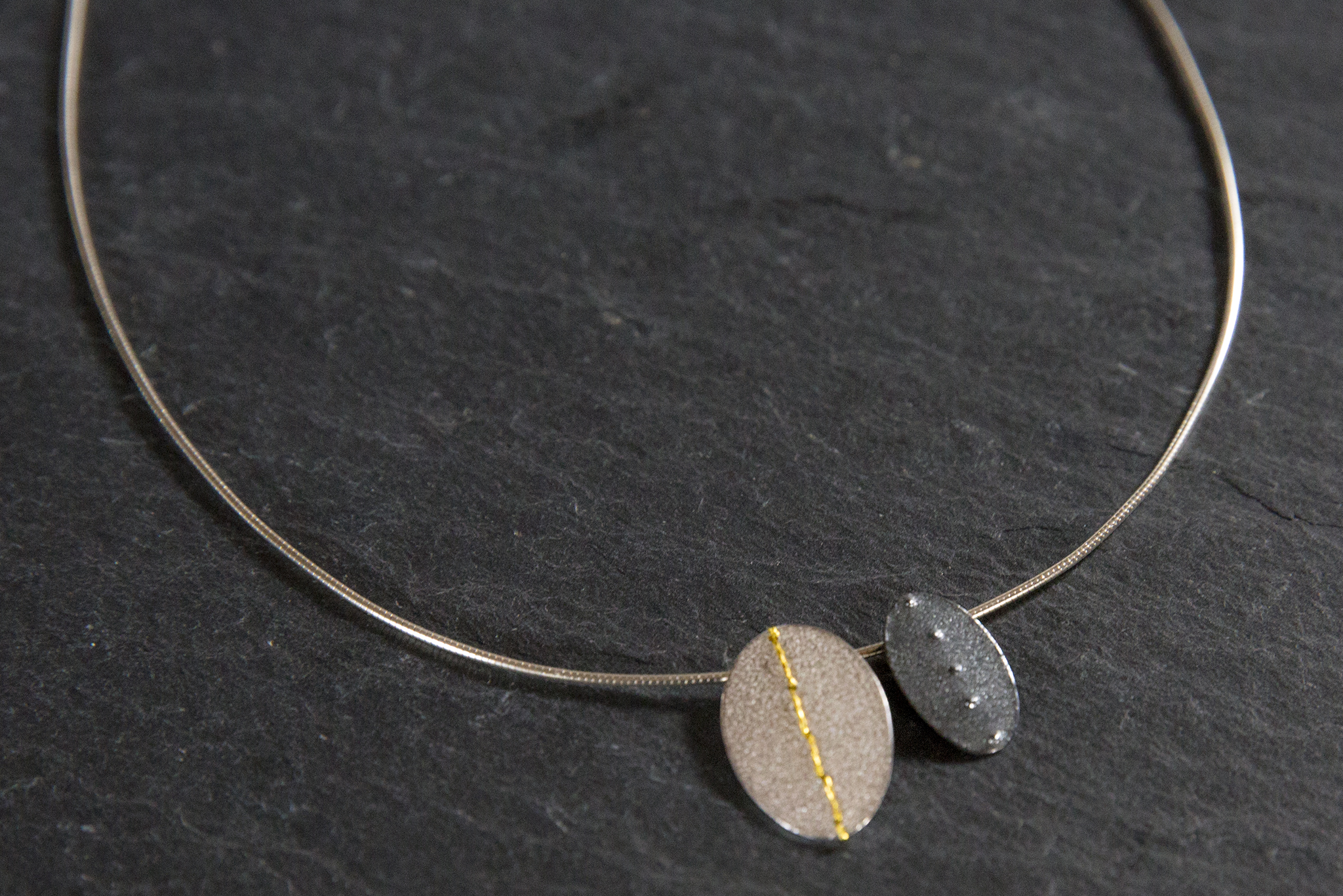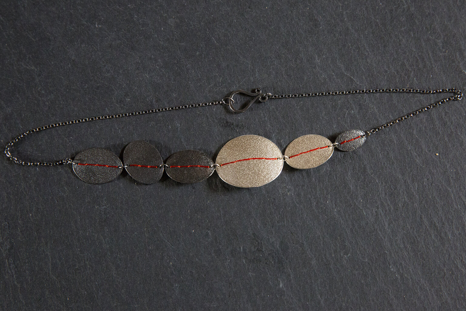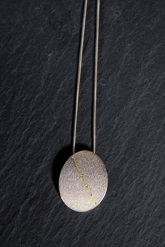 Her work is mainly in sterling silver but uses small touches of gold and gold plating. She writes: "I love the versatility of silver, how such a strong unyielding material can be manipulated in so many ways into so many different forms. I often oxidise parts of my work for contrast and add texture using various hammer strokes and by rolling with different materials. The inspiration for the Sewn-Up collection came from a basketful of embroidery threads purchased at a charity shop, so many colours and textures I wanted to incorporate them into my jewellery. I also collect beach pebbles, in particular the pebbles with a white line of quartz running through them; the Sewn-Up collection was the outcome of these two ideas, pebble shaped pieces with coloured quartz stitches."