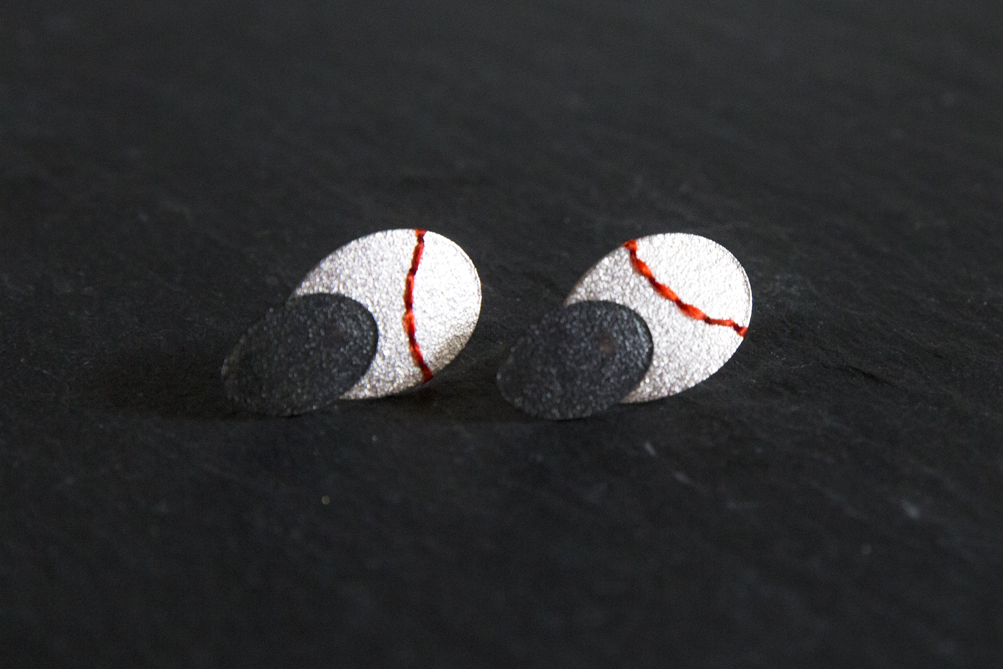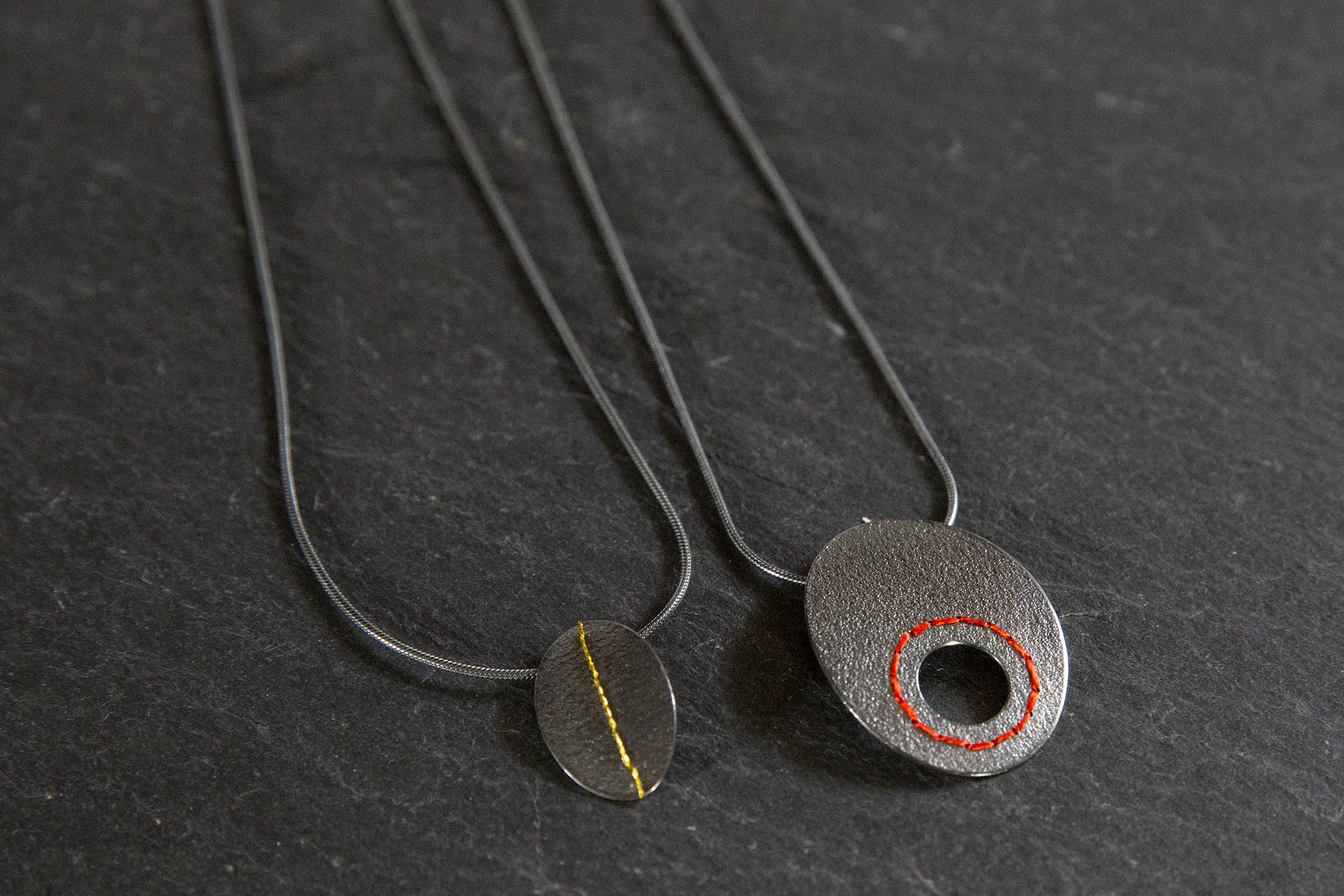 The silver discs are embossed with a sandpaper texture, created using traditional techniques. The end result is a study of line and form, with soft subtle textures in contrast with the use of bright bold thread, creating beautiful contemporary pieces.