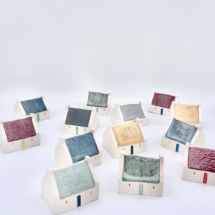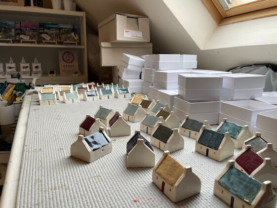 The process begins by shaping a piece of stoneware clay into a croft house shape using a range of tools. This takes approximately 40 minutes. I then leave the piece to dry for 2 weeks prior to bisque firing the piece in a kiln. I then apply 4 layers of glaze and refire the piece to create a shiny colourful finish. The glazing process is tricky as different coloured glaze will run together. Therefore I have to ensure that a very small area is left unglazed between glaze colours.