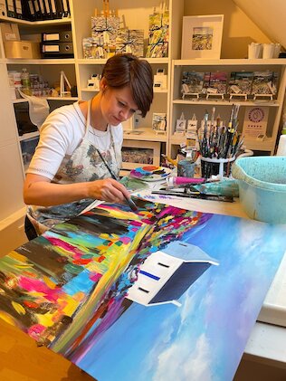 The process begins with a photograph, from there I create a basic sketch/outline. I then begin painting in the sky. The central part of each painting contains the most detail, this takes time, I like to include accuracy and produce a main focal point. The foreground is more fun, I add lots of colours and texture by building up layers of paint with different shaped brushes. The final addition is a splatter technique, which is very messy but adds an interesting element to the artwork