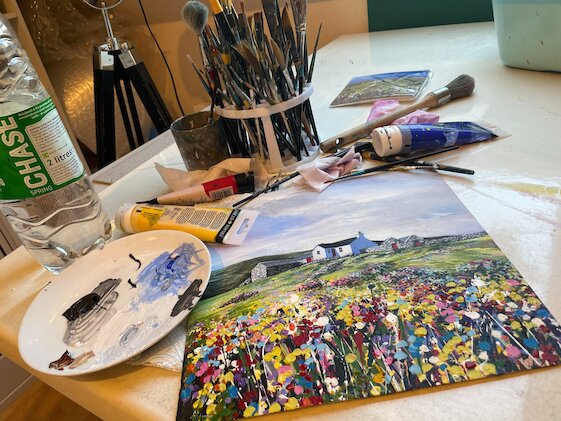 My practice has changed dramatically over the years. I used to produce very detailed pencil drawings of the Lerwick Lanes. Over the years I have become more focused on bright colours and I have started using a range of different painting techniques to add texture and depth. My work is also much larger in size now. I recently bought a kiln and I have been developing my ceramic knowledge and skills which has been fun and very messy.